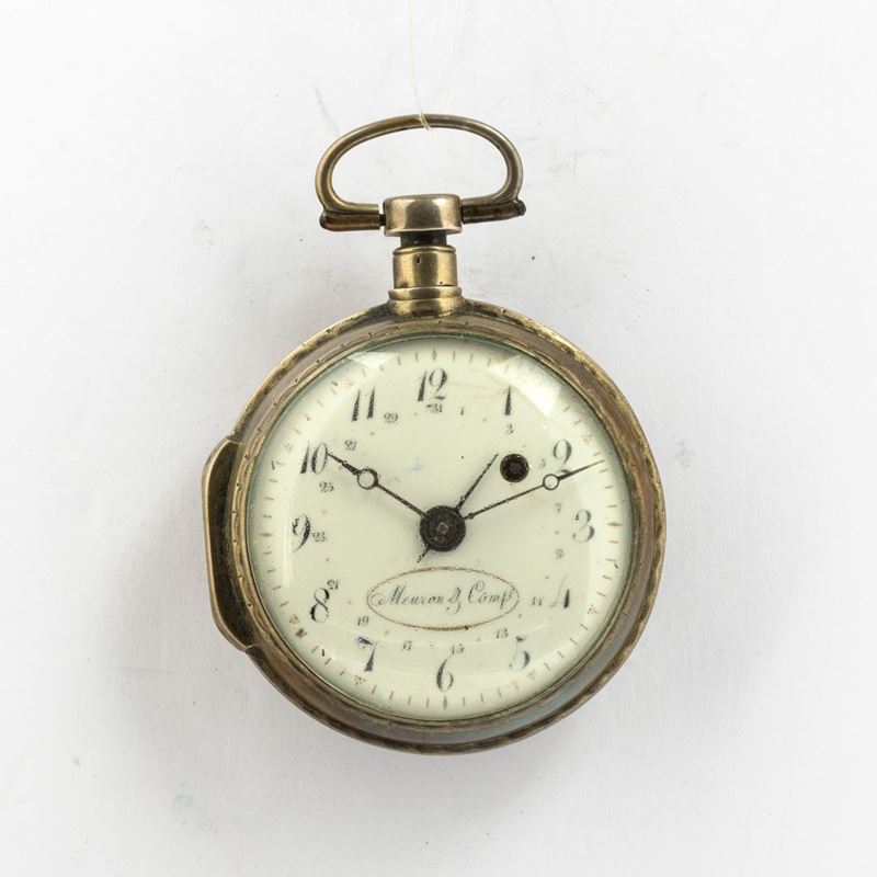 Orologio da tasca "Meuron et Co" del 1840 circa in argento (stile Paysan) movimento con scappamento verga, quadrante in smalto bianco con calendario