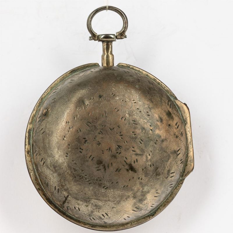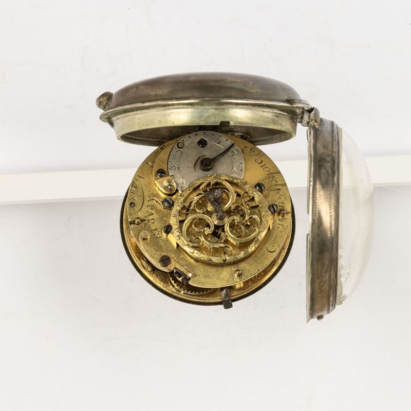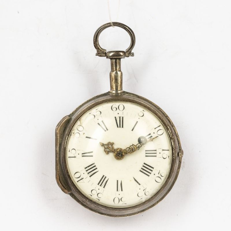 Orologio da tasca Michelle-Jeanne à Paris del 1790 circa con cassa in argento, quadrante in smalto bianco, con contenitore di protezione coevo