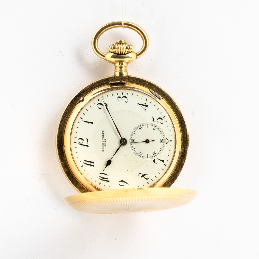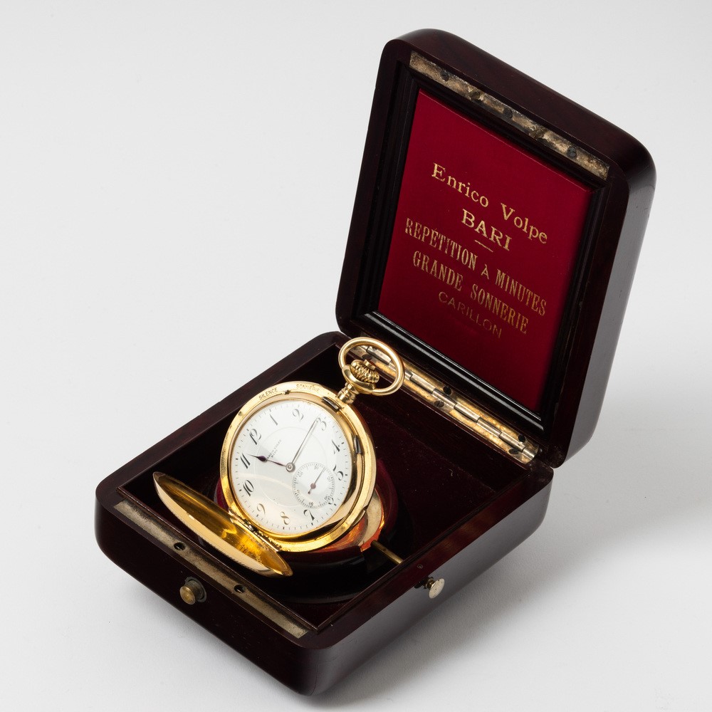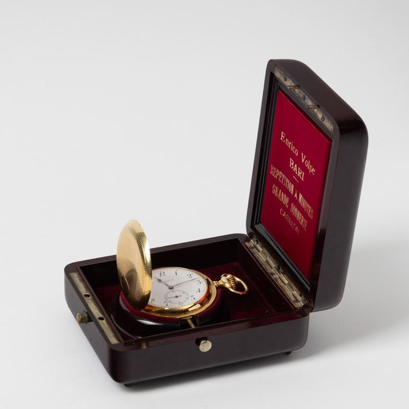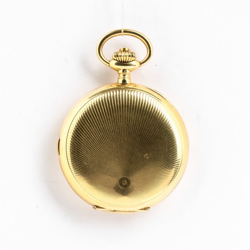 Orologio da tasca a suoneria ore/quarti al passaggio e su domanda, Enrico Volpe Bari per Zenith, circa del 1900-1910, cassa in oro 18 kt, movimento “grand sonnerie” ore e quarti a carillon su gong, scappamento ad ancora, quadrante in smalto bianco, 30 rubini