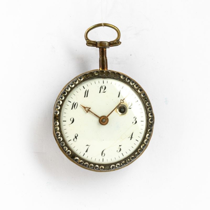 Orologio da tasca "Pernod Freres" del 1820-1830 circa, cassa in ottone dorato con smalto al retro e pietre dure su entrambi i lati, movimento con scappamento verga e quadrante in smalto bianco.