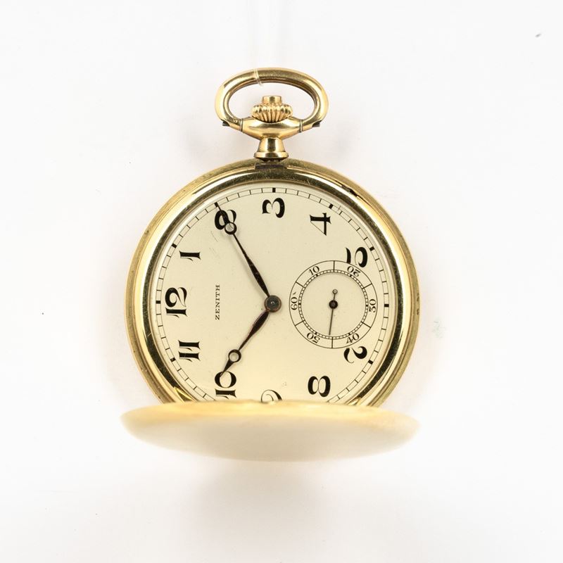 Orologio da tasca "Zenith" del 1920 circa con cassa in oro 18 kt savonette, movimento ad ancora, quadrante in metallo smaltato
