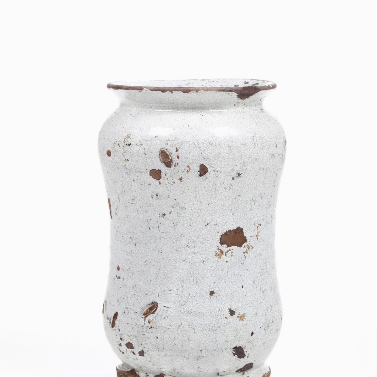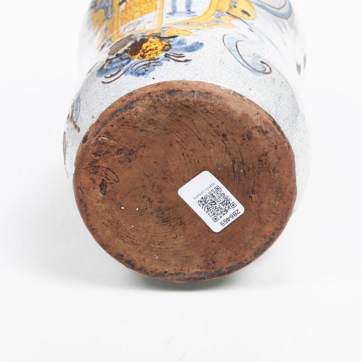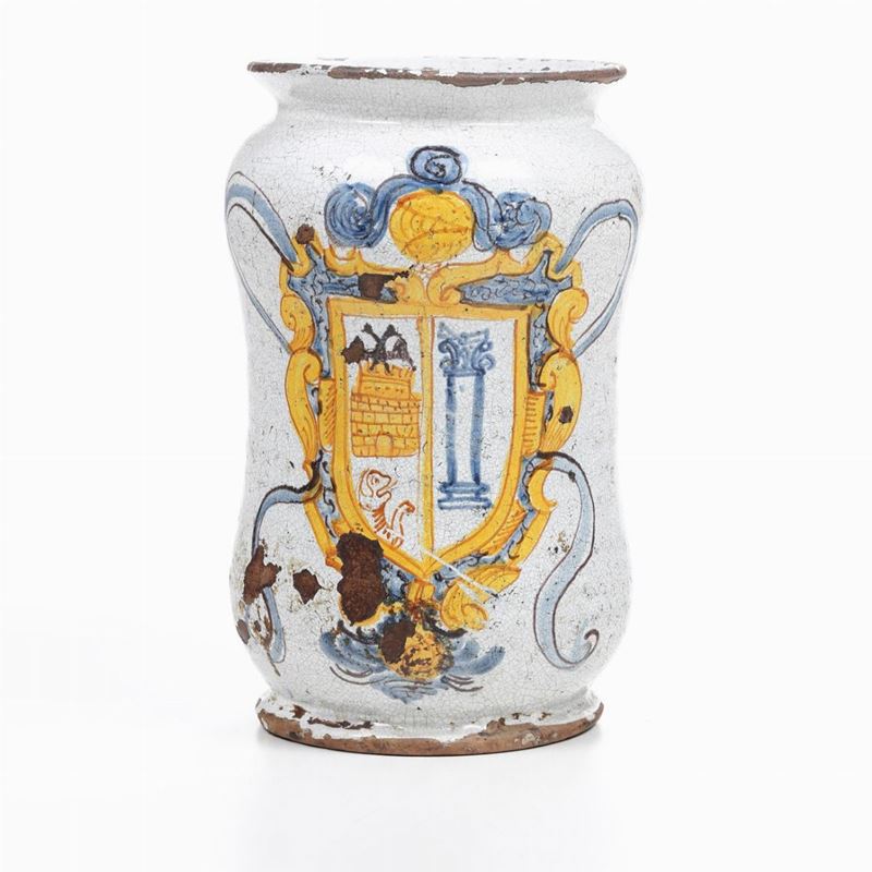 Maiolica. Altezza cm 27. Conservazione: buona; alcune cadute di smalto e sbeccatura al bordo superiore