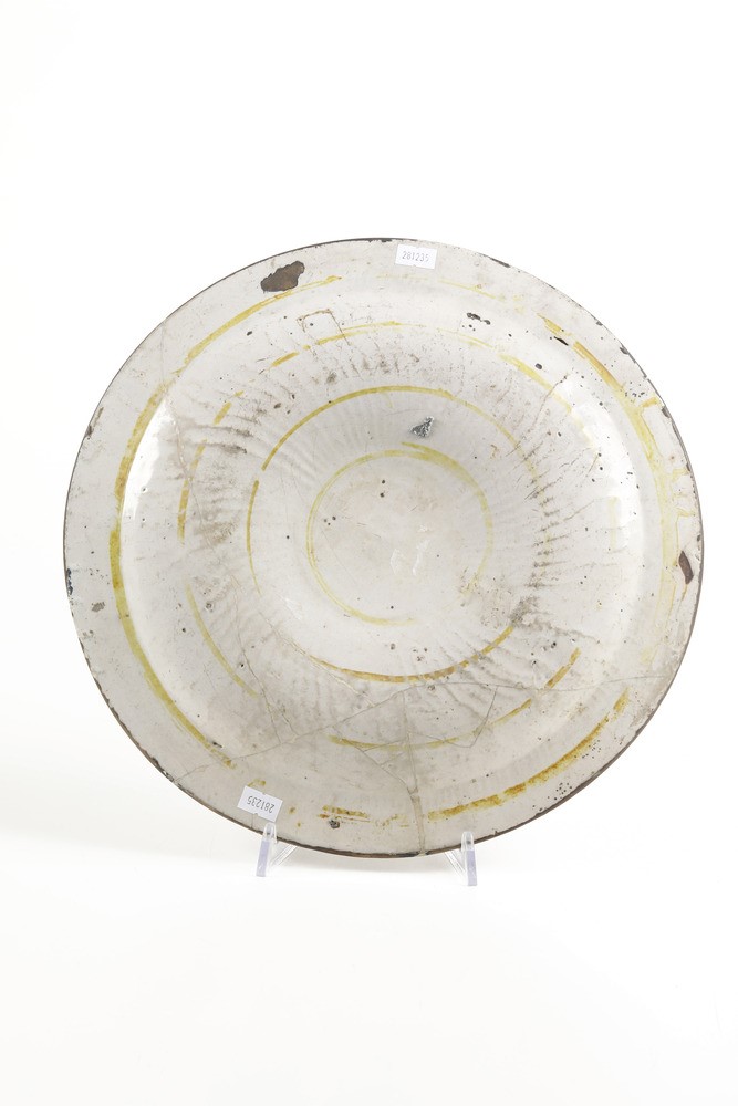 Maiolica a lustro. Dimensioni: diametro cm 33,5. Conservazione: rotto in più frammenti e ricomposto in restauro