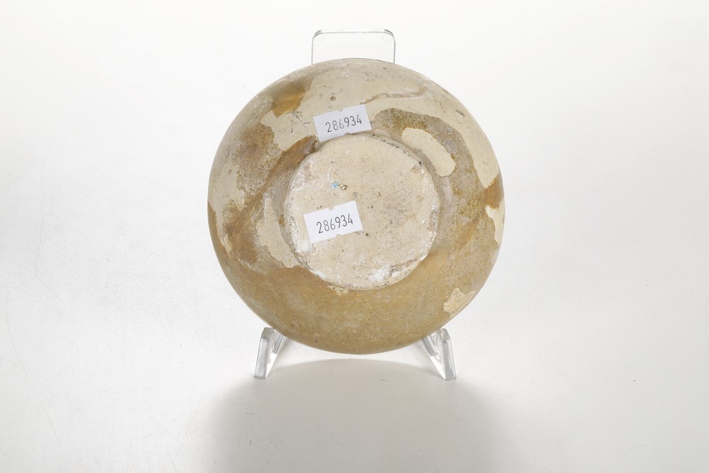 Maiolica arcaica. Dimensioni: altezza cm 6; diametro cm 12,2. Conservazione: un frammento rotto e incollato; tracce di restauri ai lati della coppa.