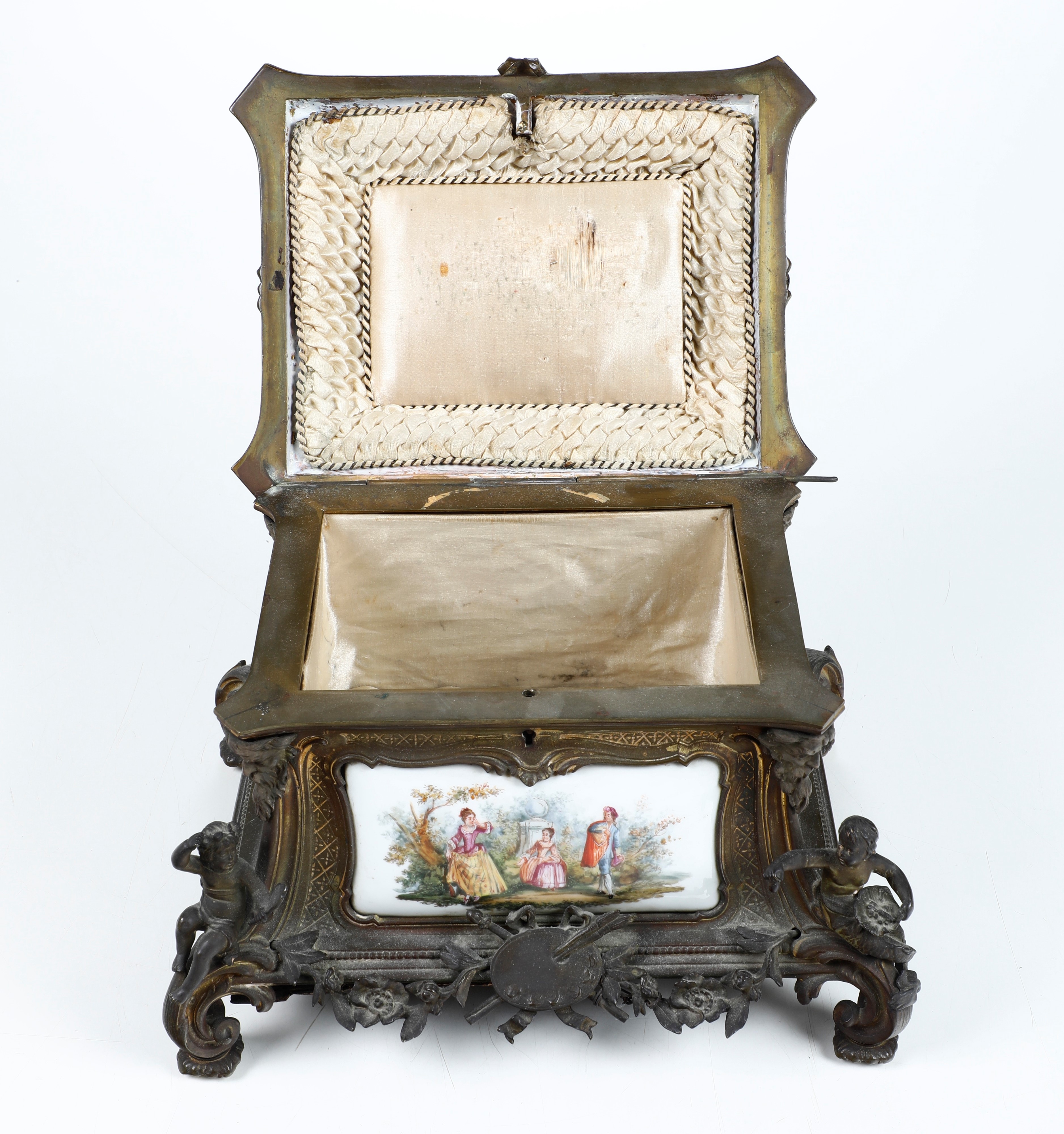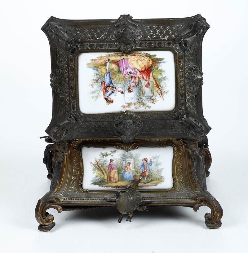 Metallo e porcellana policroma. Dimensioni: altezza cm 16,2; 25x19. Conservazione: ottima