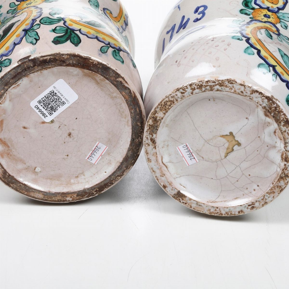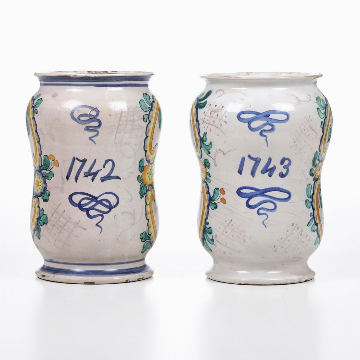 Coppia di albarelli datati 1742-43.
