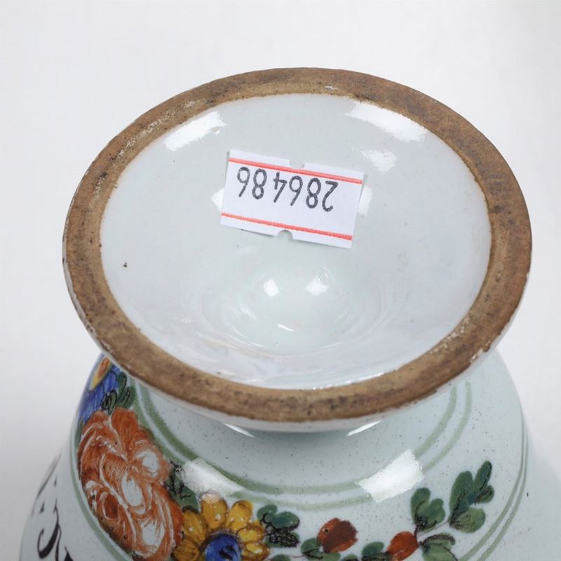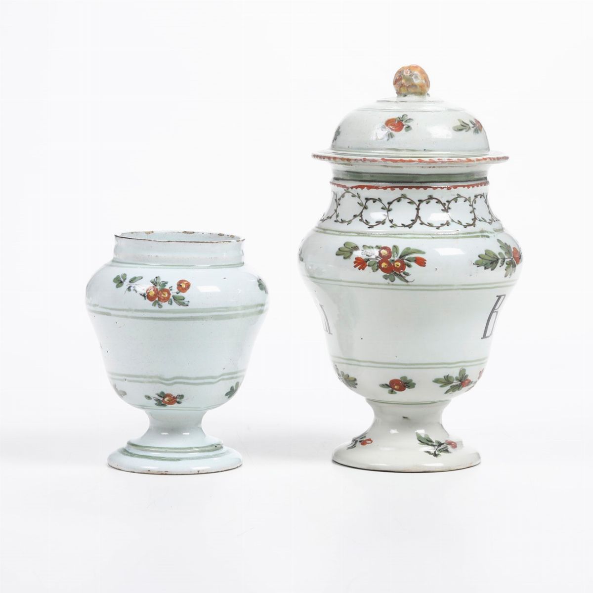 Maiolica. Marca: assente. Altezza cm 20,5; cm 12. Conservazione: albarello piccolo in ottimo stato, insignificanti sbeccature e felatura; l'altro con piede e coperchio restaurati