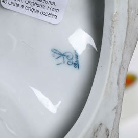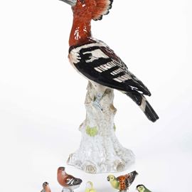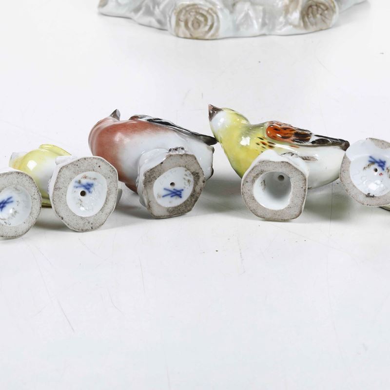 Al lotto si aggiungono 5 piccole figure di volatili di Meissen, XX secolo (altezza massima cm 6; importanti mancanze)