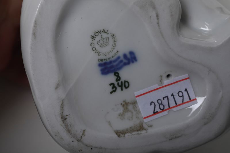 Porcellana bianca. Marca: corona con "Royal Copenhagen Denmark" in verde; onde in blu. Dimensioni: altezza cm 18,5; 11 x 13. Conservazione: ottima.