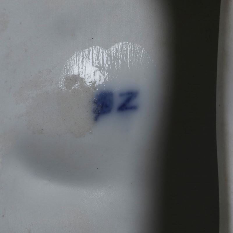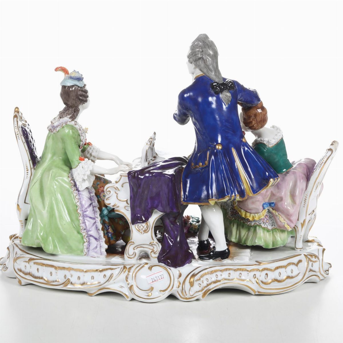 Porcellana. Marca: “N” con corona, in blu. Dimensioni: altezza cm 33,3; 37x25,5. Conservazione: ottima; dita mancanti alla figura maschile; una sedia rotta in più frammenti e incollata.