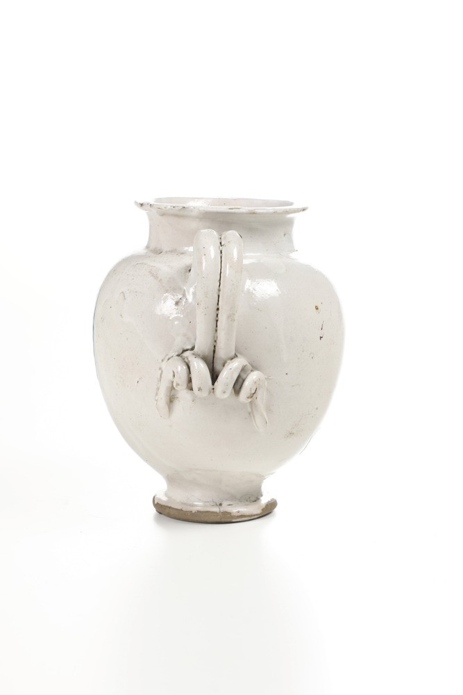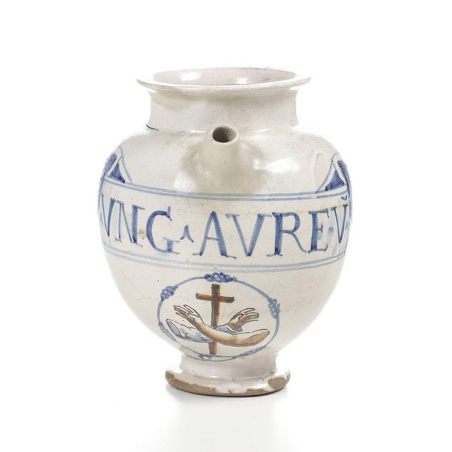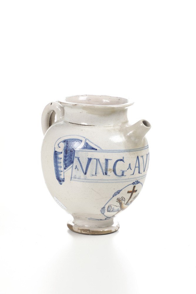 L'orciolo ospita, sotto la fascia con la scritta apotecaria, un medaglione che racchiude lo stemma dell'Ordine Francescano: una croce latina è sormontata da un braccio nudo che incrocia uno vestito. Le due braccia simboleggiano i due rami dell'Ordine, ossia i frati e il terzo ordine dei laici.