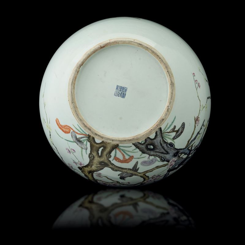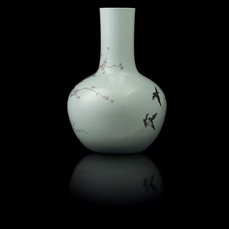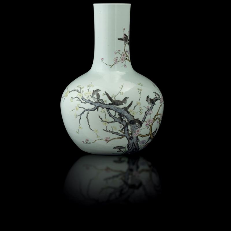 Possibly Qianlong period (1736-1796), marked. Falangcai-style decor with birds on cherry blossom branches