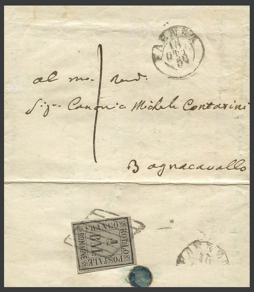 affrancata con 1 baj di Romagne (S. 2), in tariffa di lettera circolante all'interno della stessa Direzione (di Faenza). Al verso bollo di transito di Lugo del 16 e di arrivo a Bagnacavallo del giorno stesso. Molto bella.