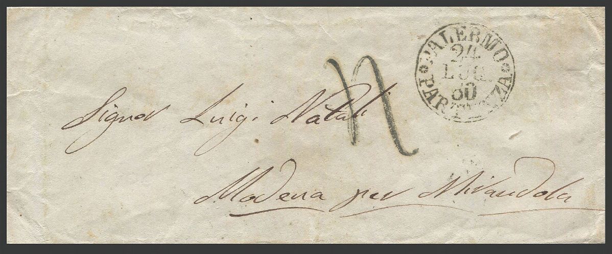 1860, Sicilia, Amministrazione Postale Siciliana dopo lo sbarco garibaldino, bustina da Palermo per Mirandola (Modena) del 24 luglio 1860