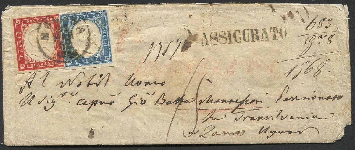 Affrancata con 20c e 40c di Sardegna, il 40c. appena sfiorato a destra, in tariffa di primo porto via di Austria (20c. + 40c per raccomandazione). Al verso, bolli ambulanti “Bologna - Alessandria” - 21 marzo; “Milano a Desenzano”- 22 marzo; “Klausenburg” (Cluj-Napoca - Romania) 26 marzo; di arrivo a Szamos Ujvar del 27 marzo. Rara destinazione, di ottimo aspetto.