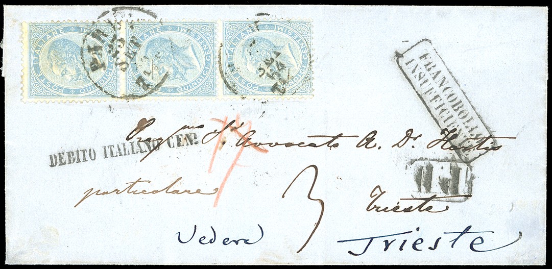 Affrancata con striscia verticale del 15 cents. (S. 18), considerata erroneamente Parma come II distanza anziché I, quindi tassata 3 kr., mentre, in realtà, la lettera è sovraffrancata. Vari bolli di transito, ambulanti e arrivo al verso. Molto interessante e rara combinazione, esemplari perfetti.