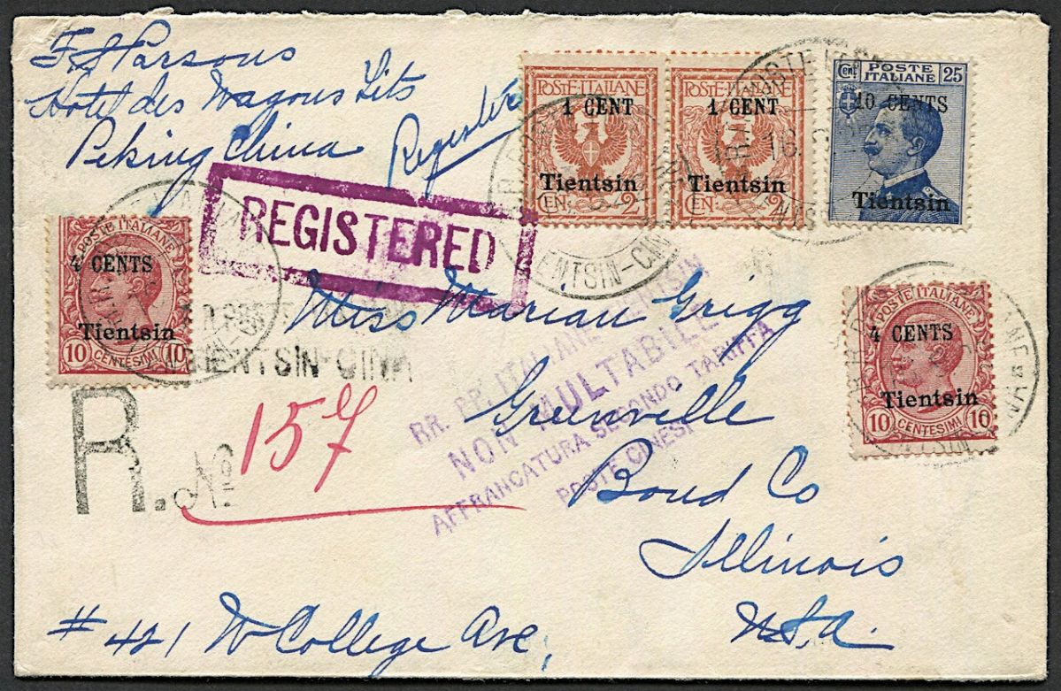 del 18 settembre 1922, affrancata per 20 cent. Con 2 es. dell’1c., 2 es. del 4c. e uno del 10c. (S. 16+ 18+ 20) in tariffa secondo le Poste Cinesi, come bollo in violetto su quattro righe. Al verso vari bolli di transito, via Italia con piroscafo, e di arrivo a Greenville del 18 novembre 1922. Molto bella e interessante.