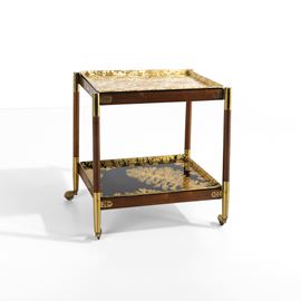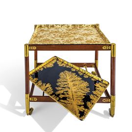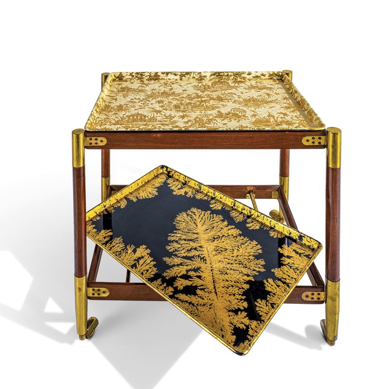 Struttura in legno e ottone con vassoi in metallo serigrafato con motivi Piccolo Coromandel e Alghe marine.
