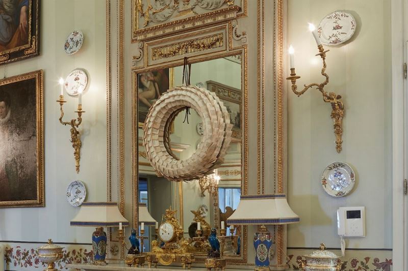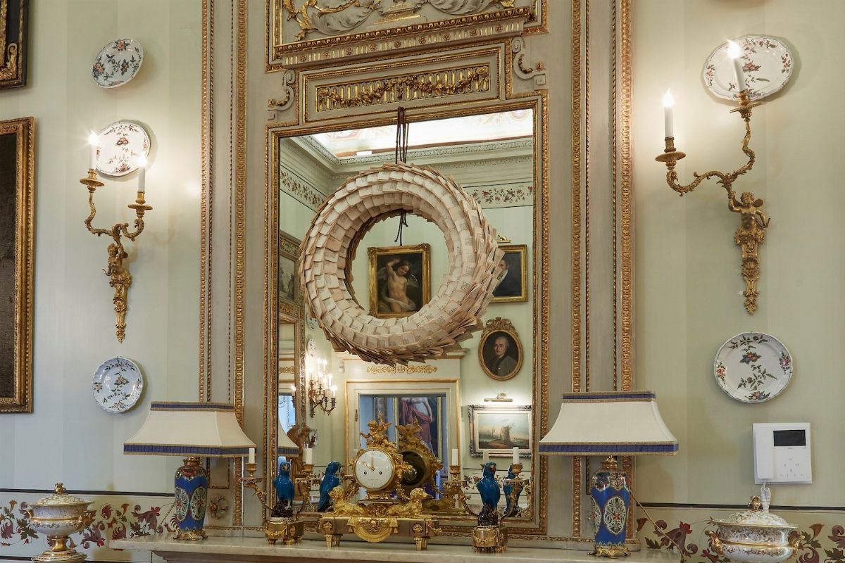 Cornice a doppio ordine ornata con modanature dorate, parte superiore intagliata a nastri e a vaso biansato da cui dipartono girali fogliati