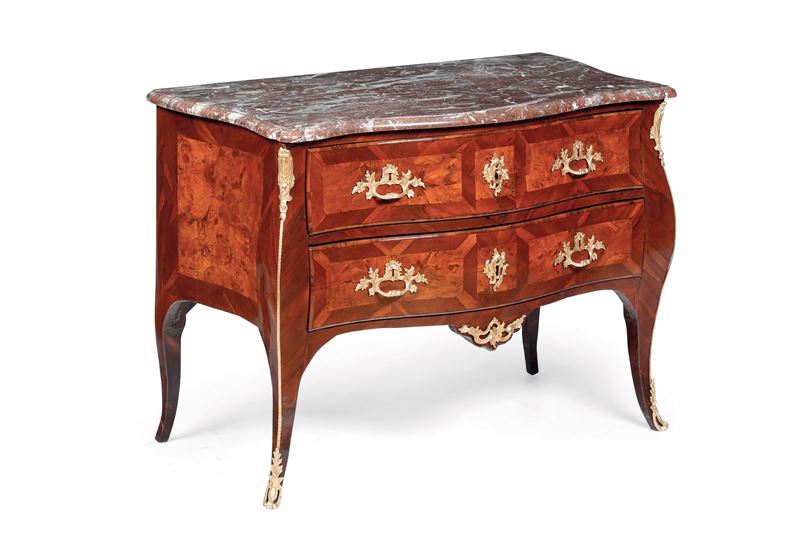 Commode Luigi XV lastronata in essenze pregiate. Francia, XVIII secolo