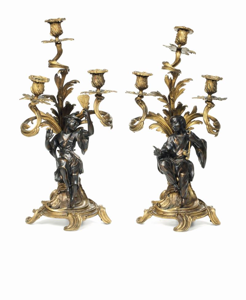 Coppia di candelabri a tre fiamme in bronzo dorato e patinato. Francia XIX secolo