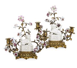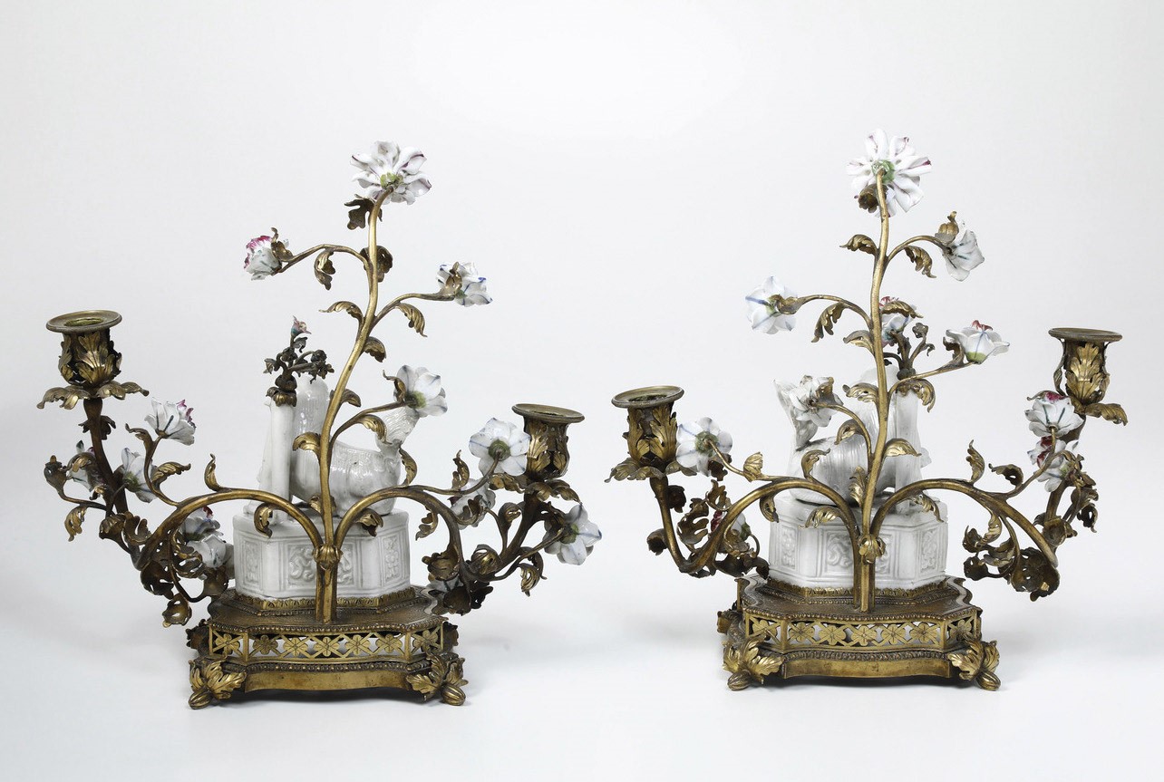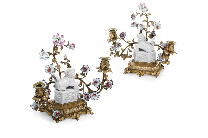 Coppia di candelabri in porcellana e bronzo dorato. Francia, XVIII secolo