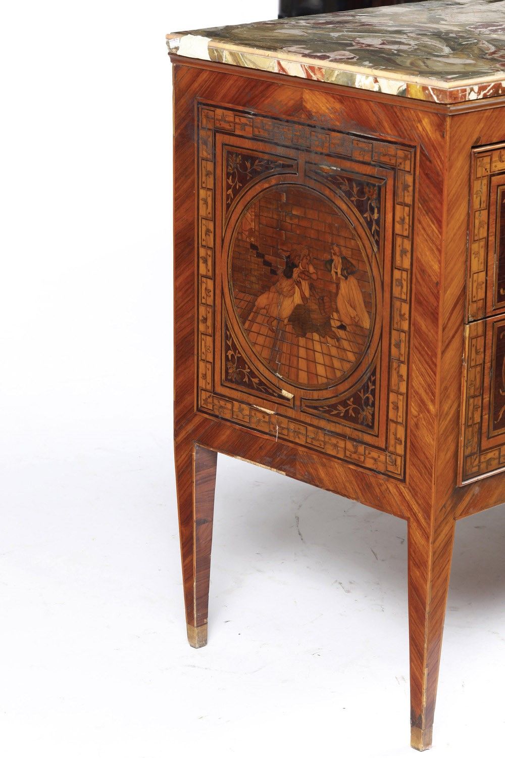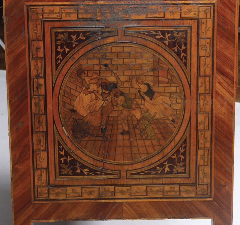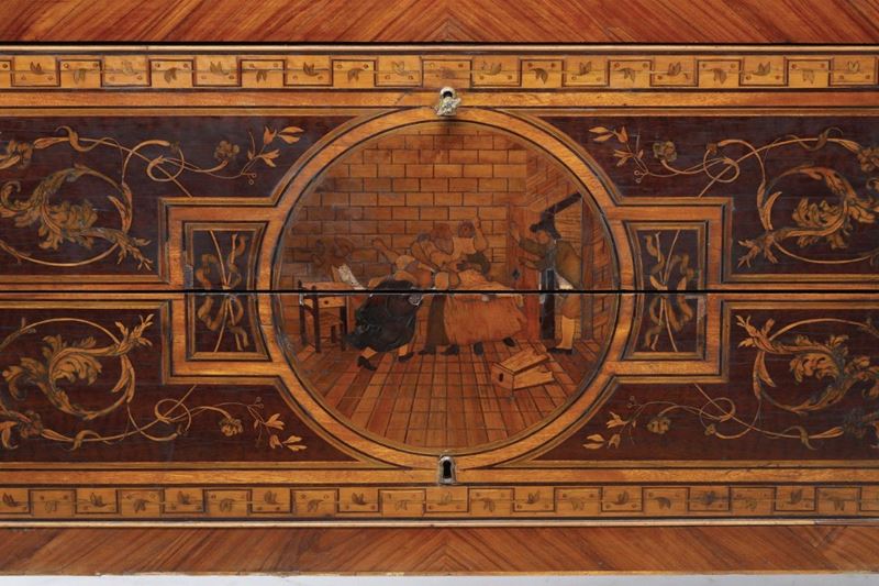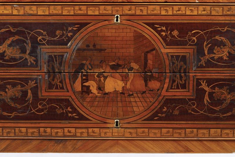 ricco intarsio sul fronte e sui fianchi in varie essenze pregiate a motivi di girali fogliacee e figure in interni entro riserve circolari