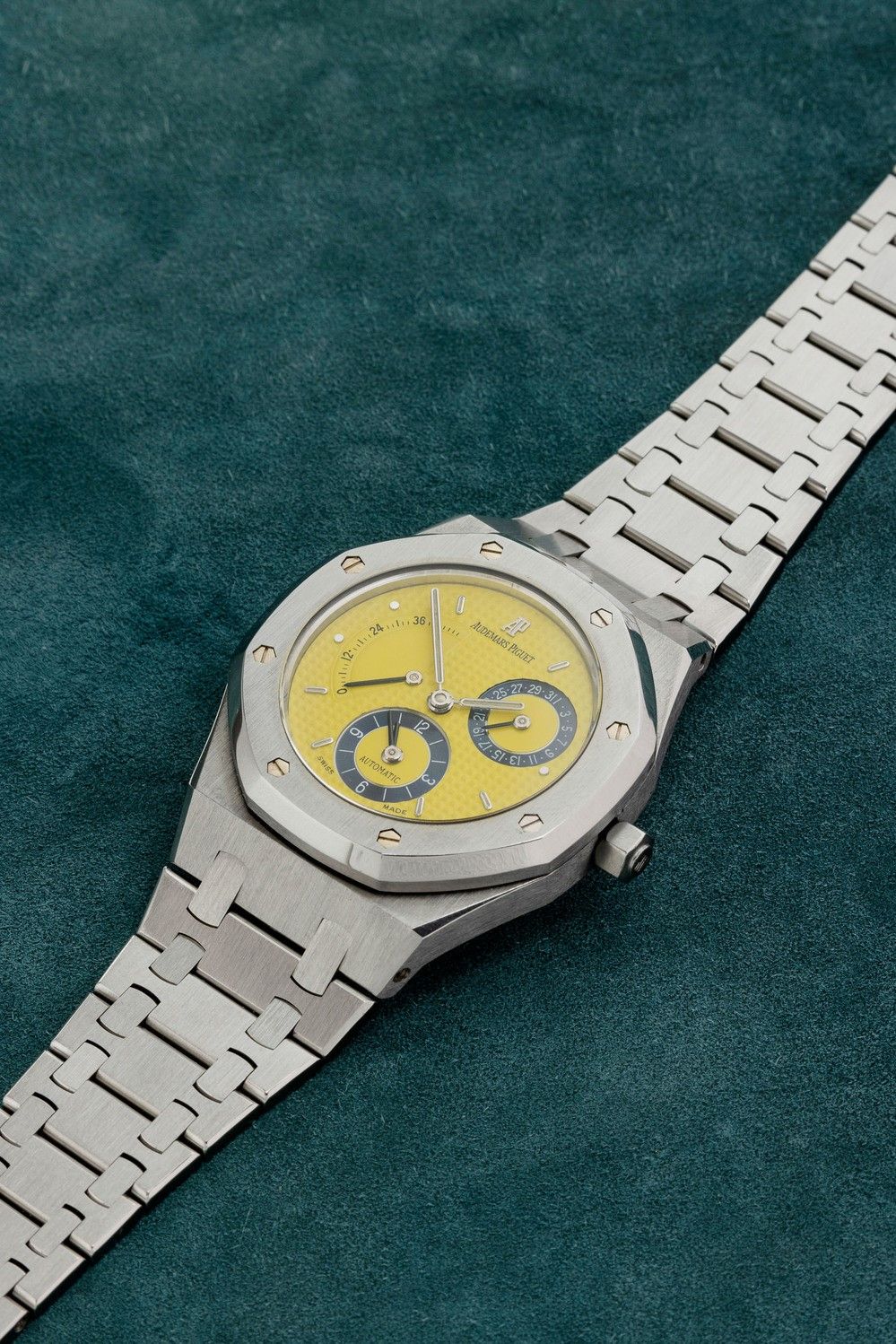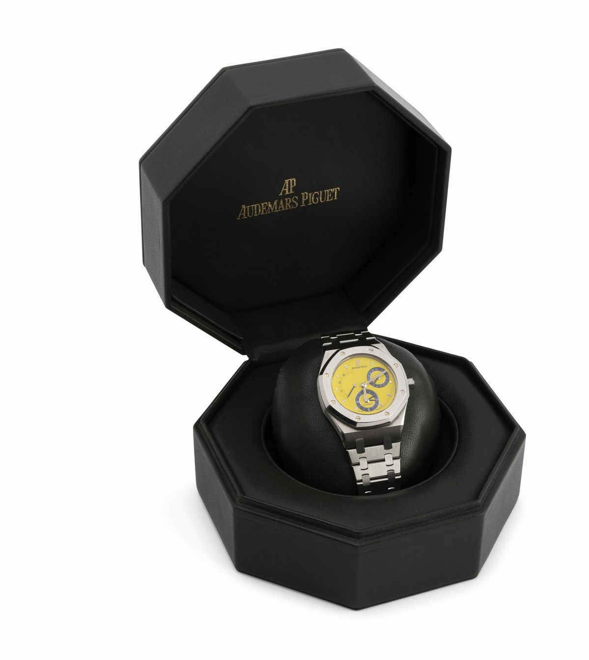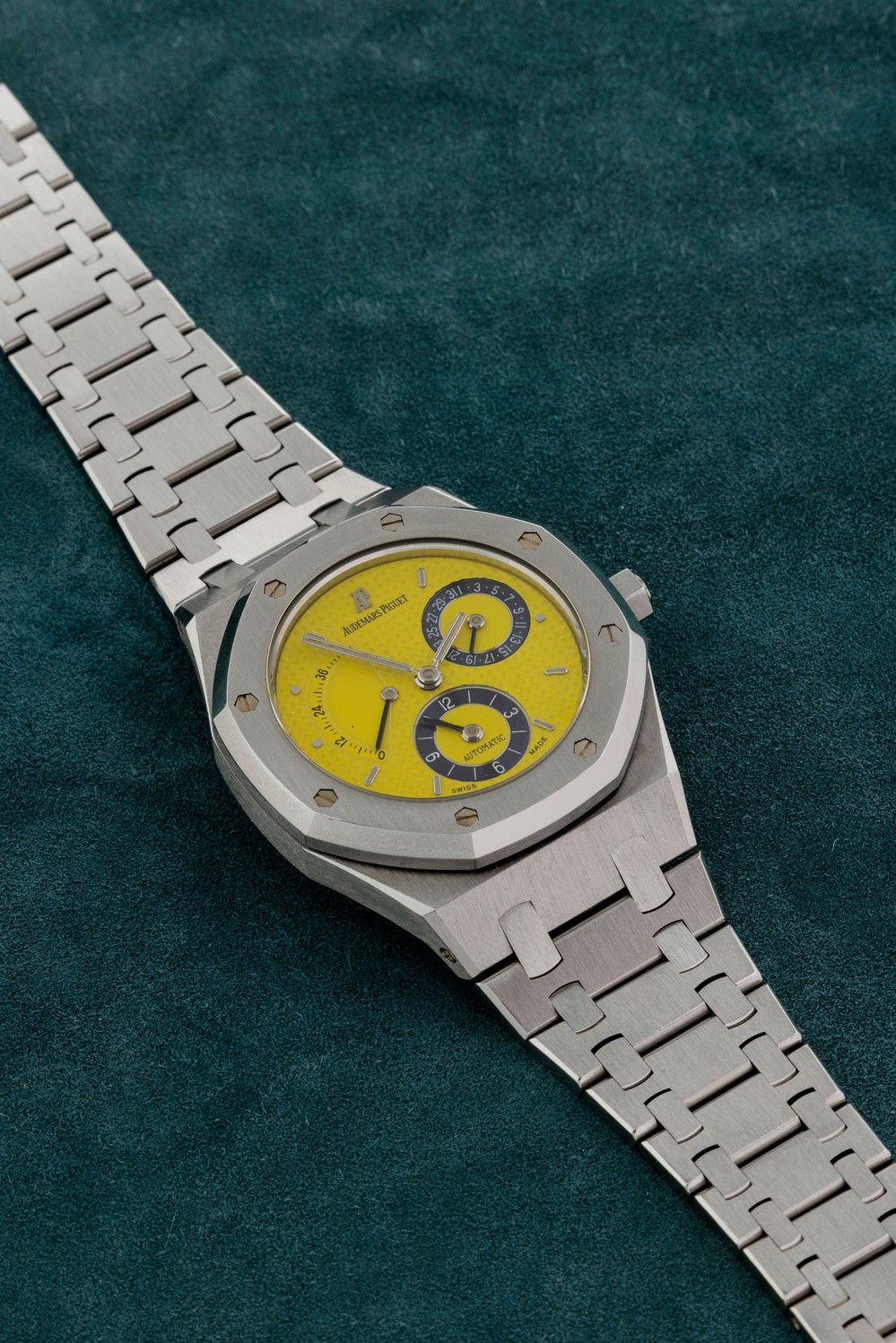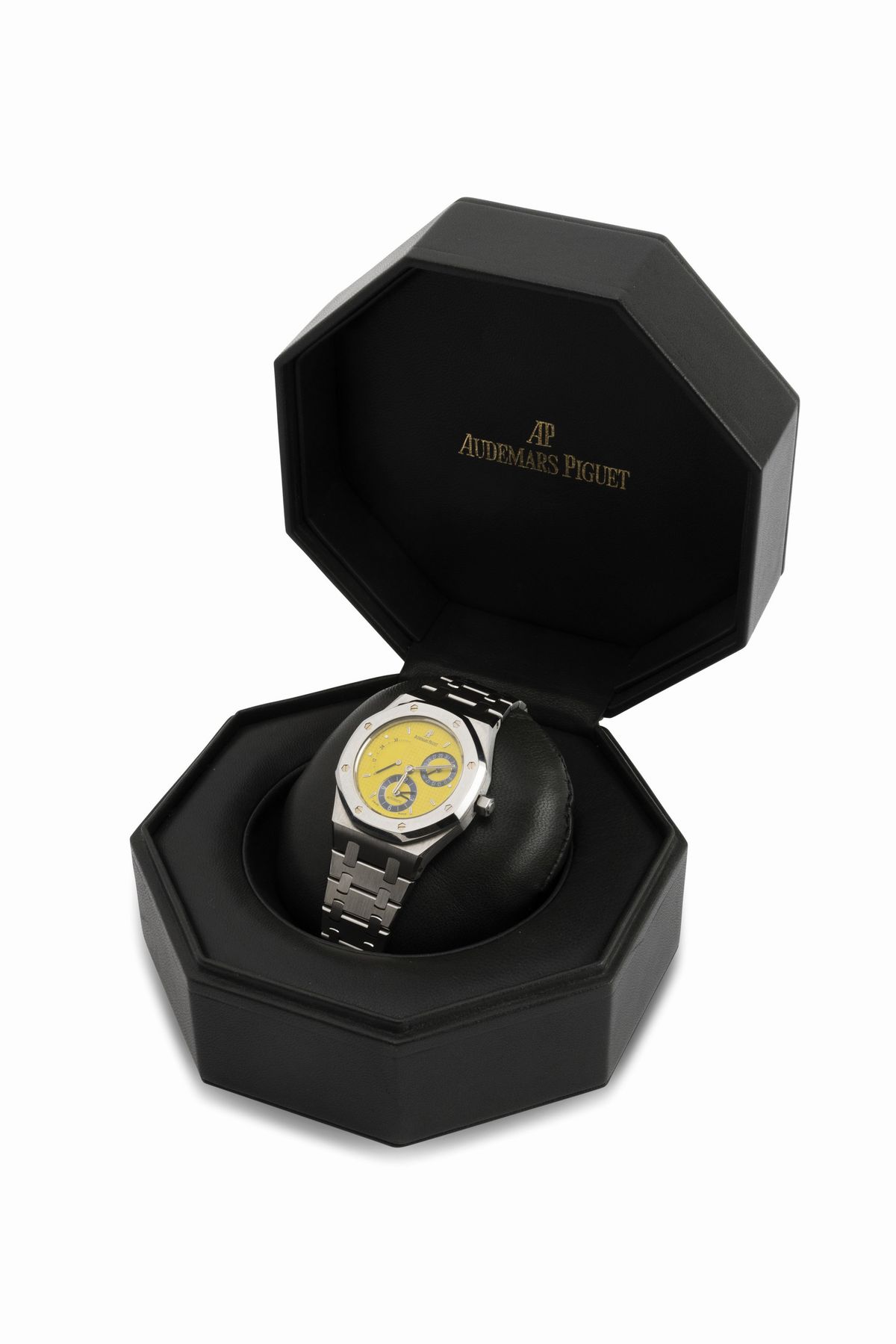 Iconic and sought-after Royal Oak Dual Time "Yellow Ferrari" steel wristwatch with power reserve and date display accompanied [..]