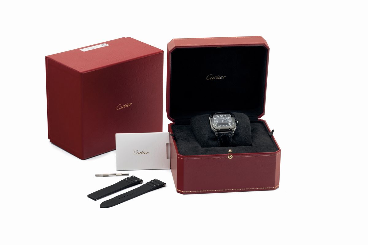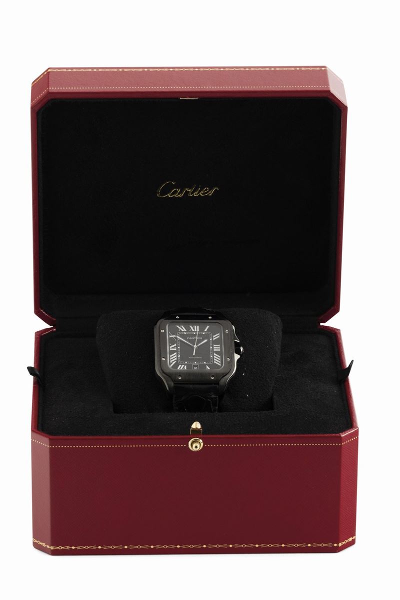 Santos automatic in DLC-treated steel, black dial with contrasting white Roman numerals, comes with box and warranty