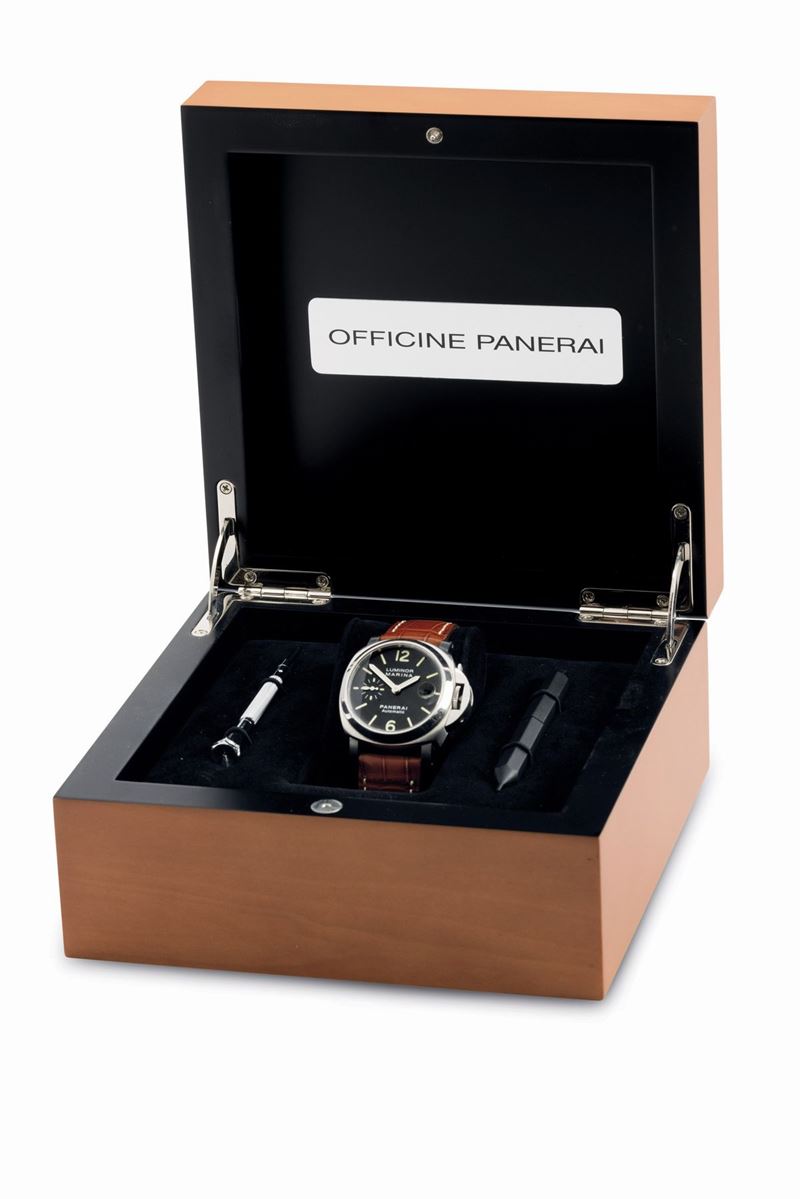 Intriguing Panerai Luminor Marina automatic in steel, black dial with luminous hands and baton hour markers