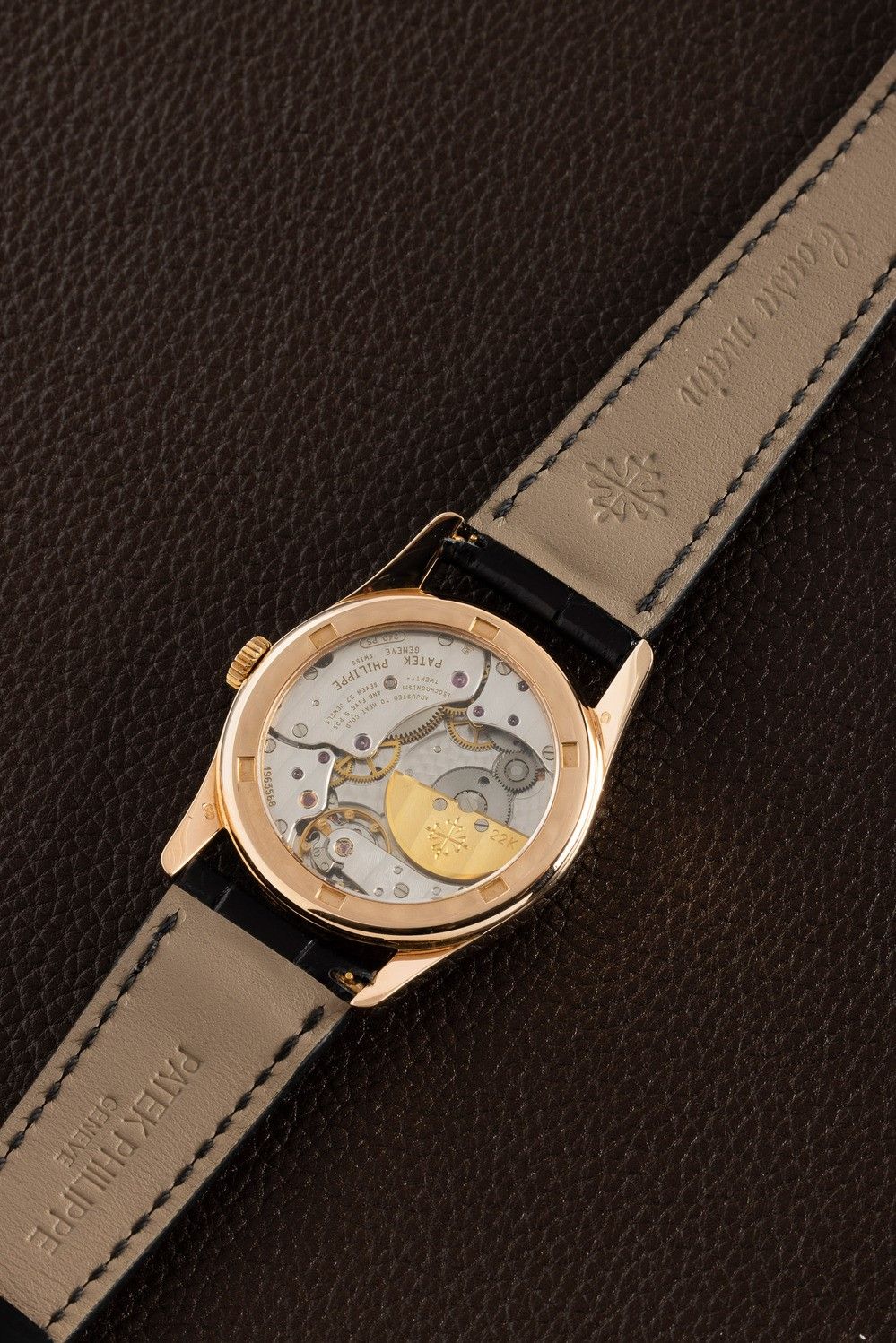 Elegant Calatrava ref 5000 R in 18k pink gold, Salmon dial with applied Arabic numerals and small seconds at 4 o'clock, automatic movement with micro-rotor and visible back