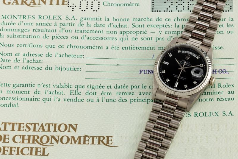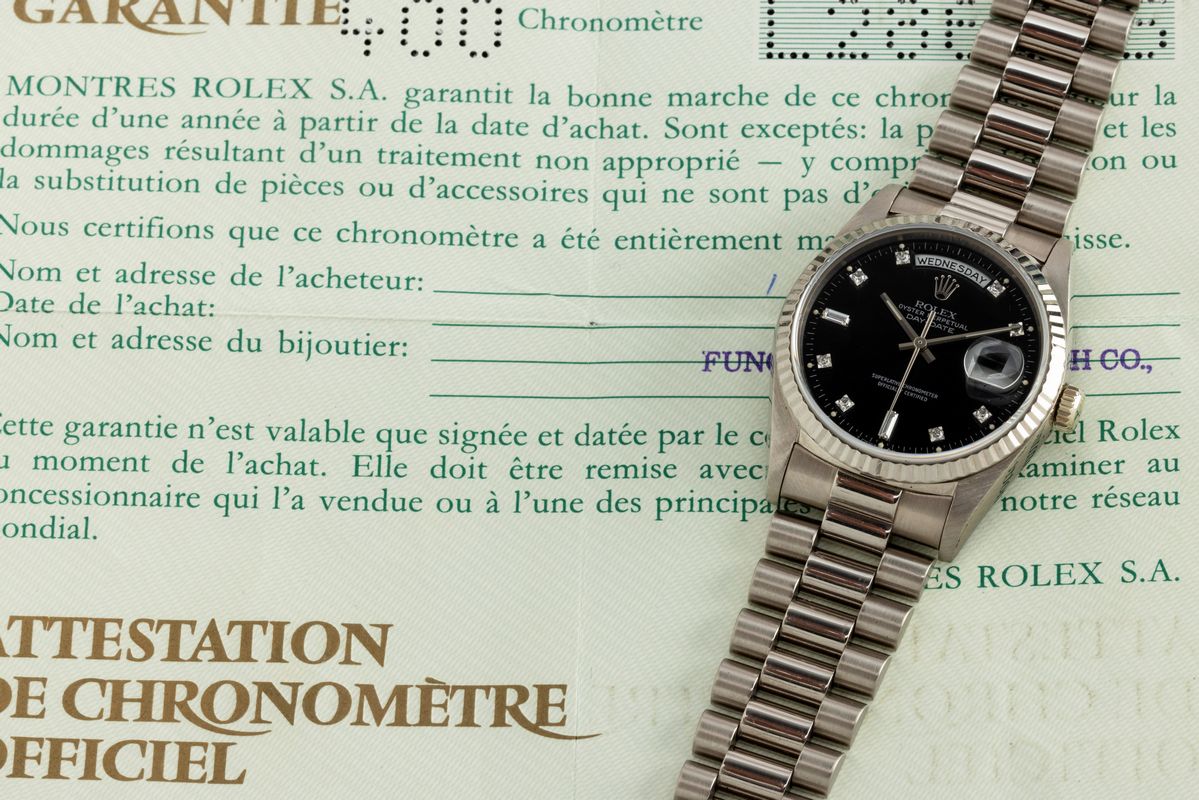Daydate ref 18239 in 18k white gold, polished black dial with diamond hour markers, President bracelet with folding clasp, accompanied by original warranty