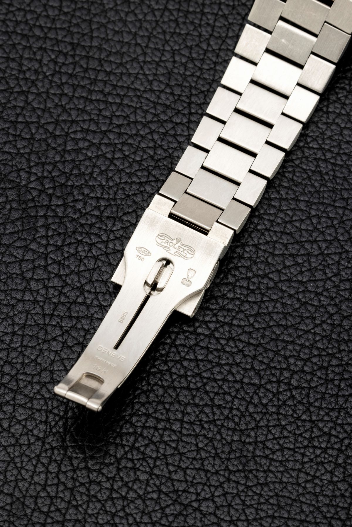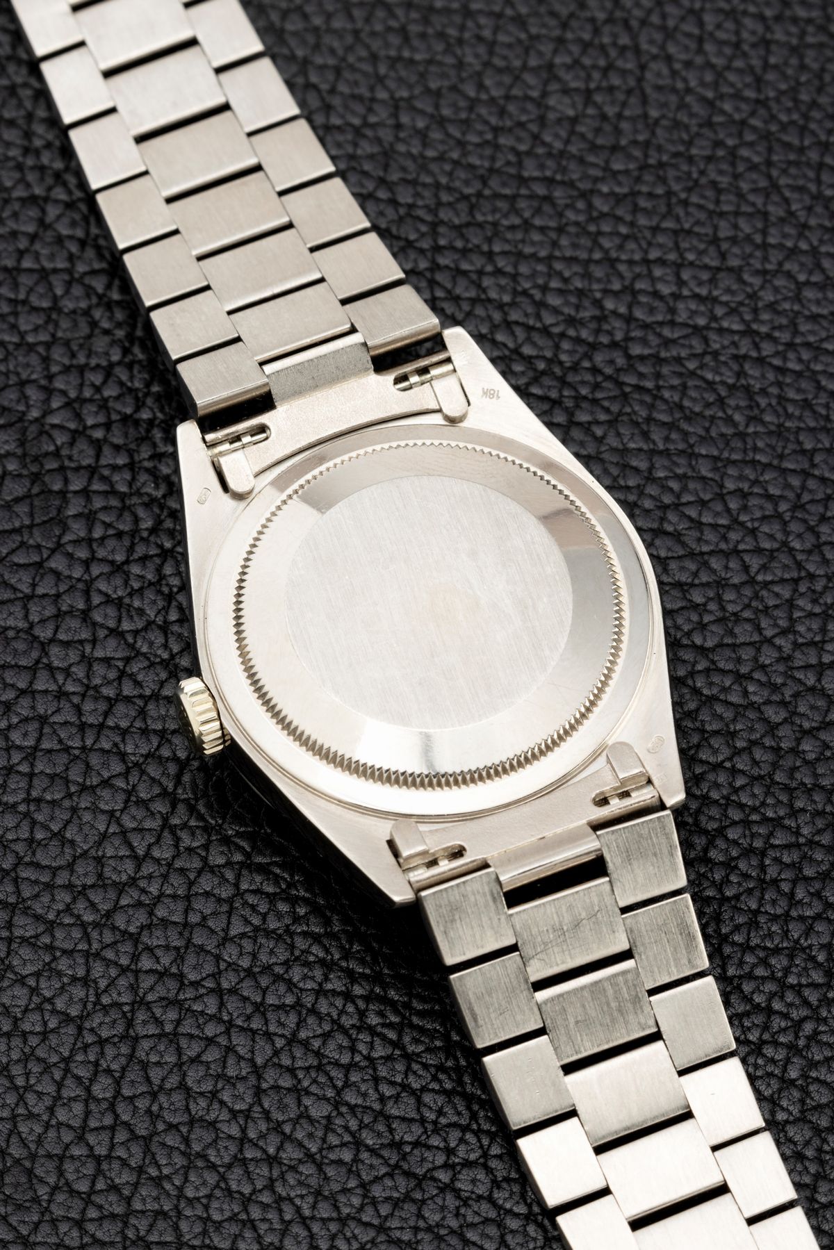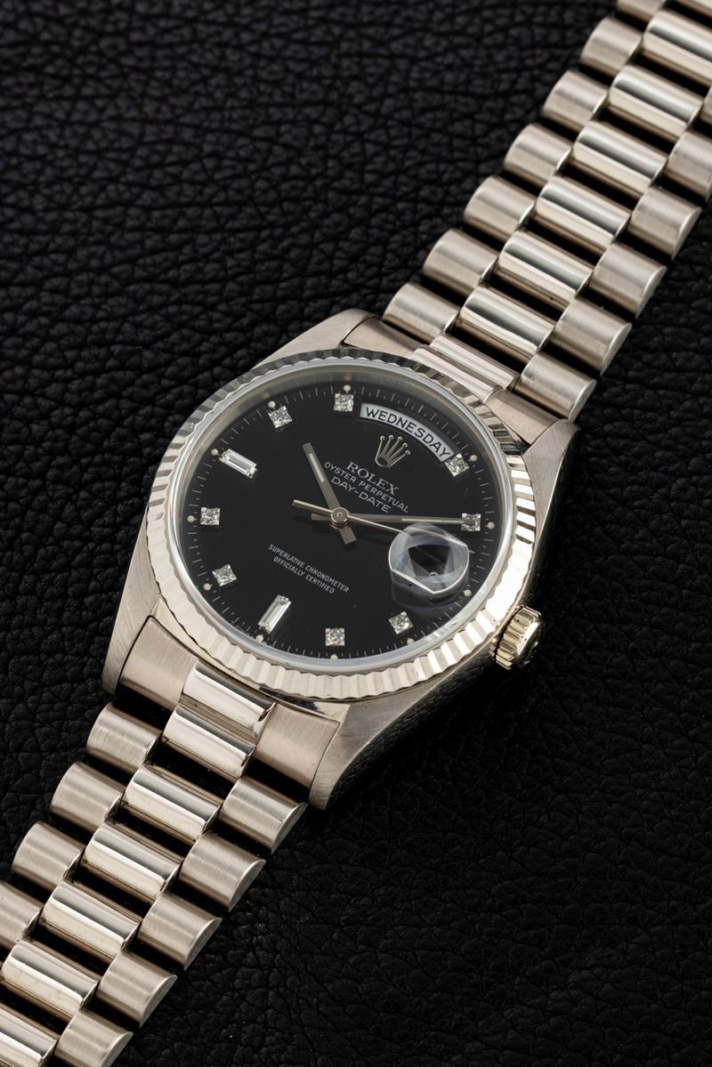 Daydate ref 18239 in 18k white gold, polished black dial with diamond hour markers, President bracelet with folding clasp, [..]