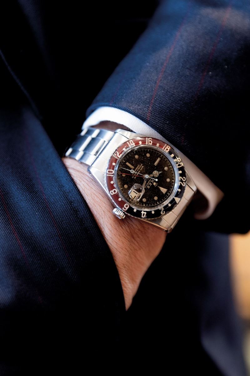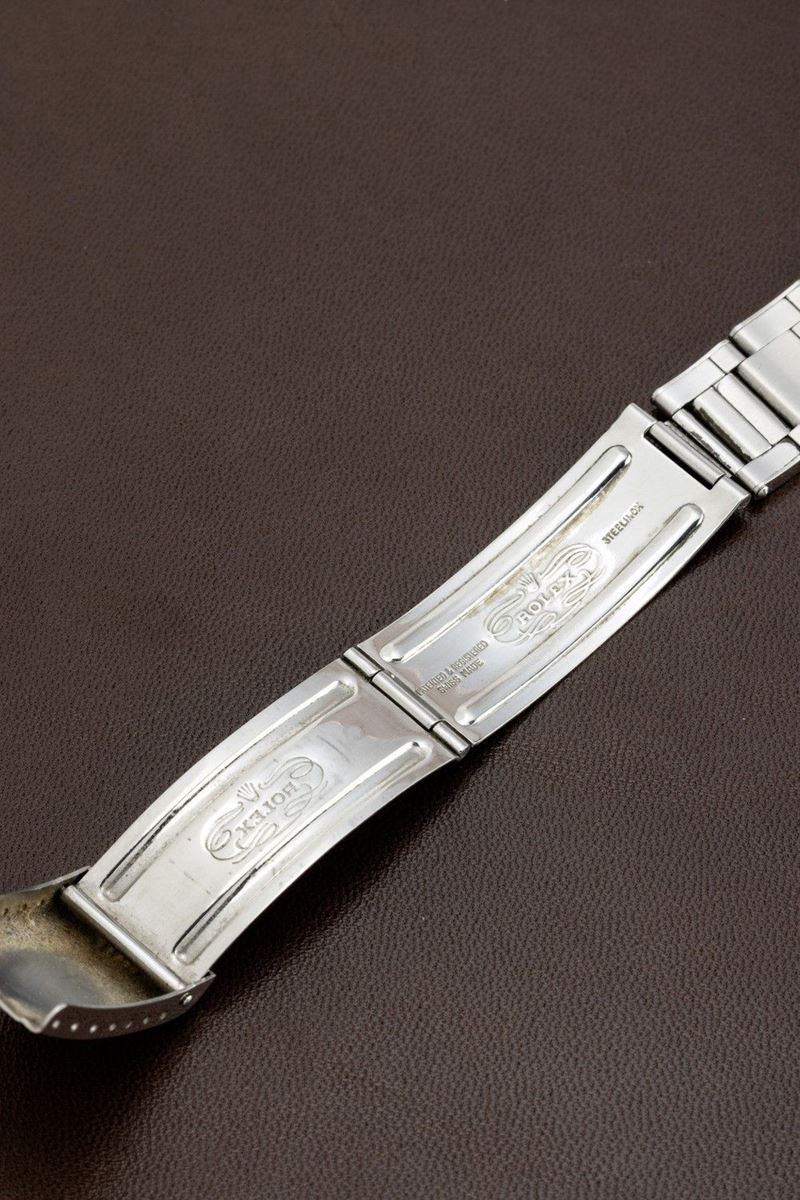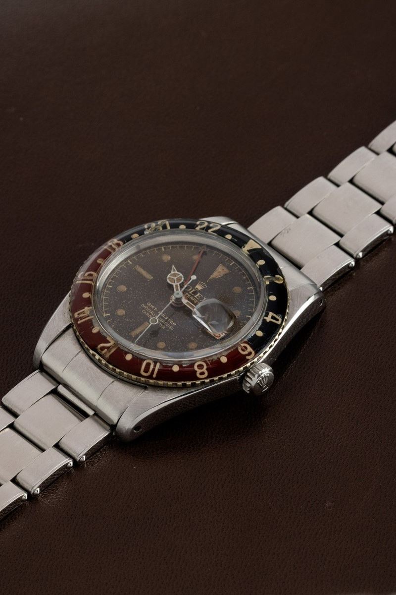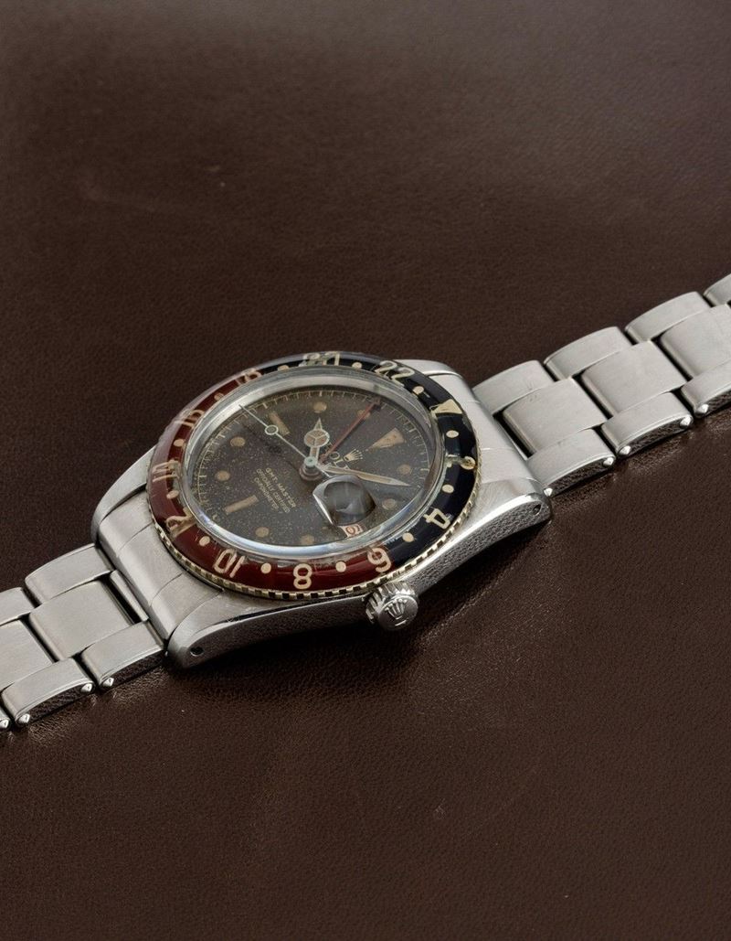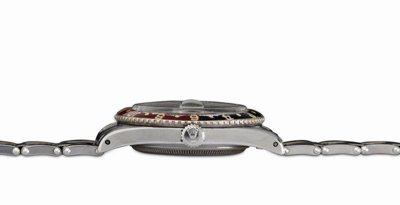 From the various tests carried out in the 1940s, it emerged that one of the methods of counteracting jet lag was to possess an instrument that would simultaneously indicate both the time zone of the place of departure and that of the flight's destination.Pan-Am, the former U.S. flag carrier, was among the first to meet this need, entrusting Rolex with the creation of a watch equipped with the specifications needed by pilots. Rolex then introduced the GMT Master model, equipped with a rotating bakelite bezel and a hand to mark the dual time zone. In the late 1950s and early 1960s, it was realized that the radioactive material that was used in making the GMT's luminous bezel was dangerous. The Maison therefore issued an announcement inviting owners of this model to return the watch to the parent company in order to replace the radioactive bakelite bezel with a metal one. The fragility of the old bezel, combined with this replacement action carried out by the Maison itself, has meant that very few examples, such as the one we propose, still have the original bakelite bezel.