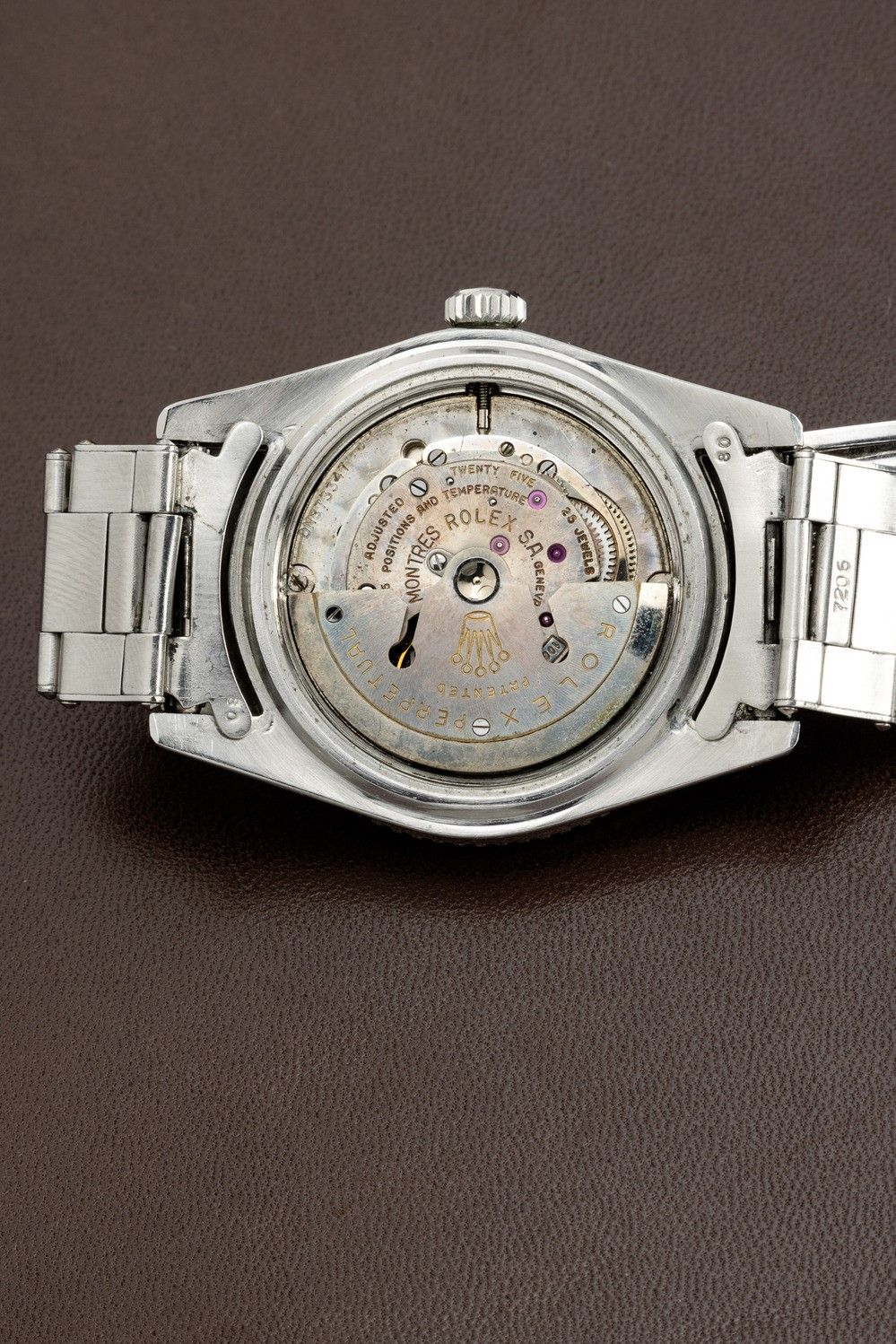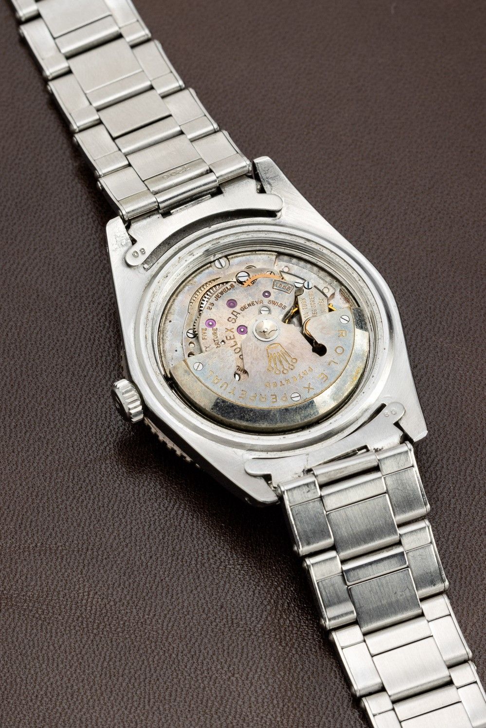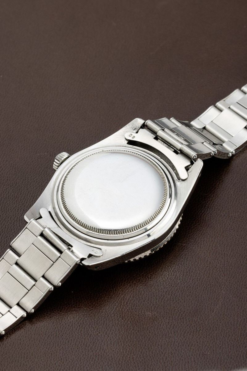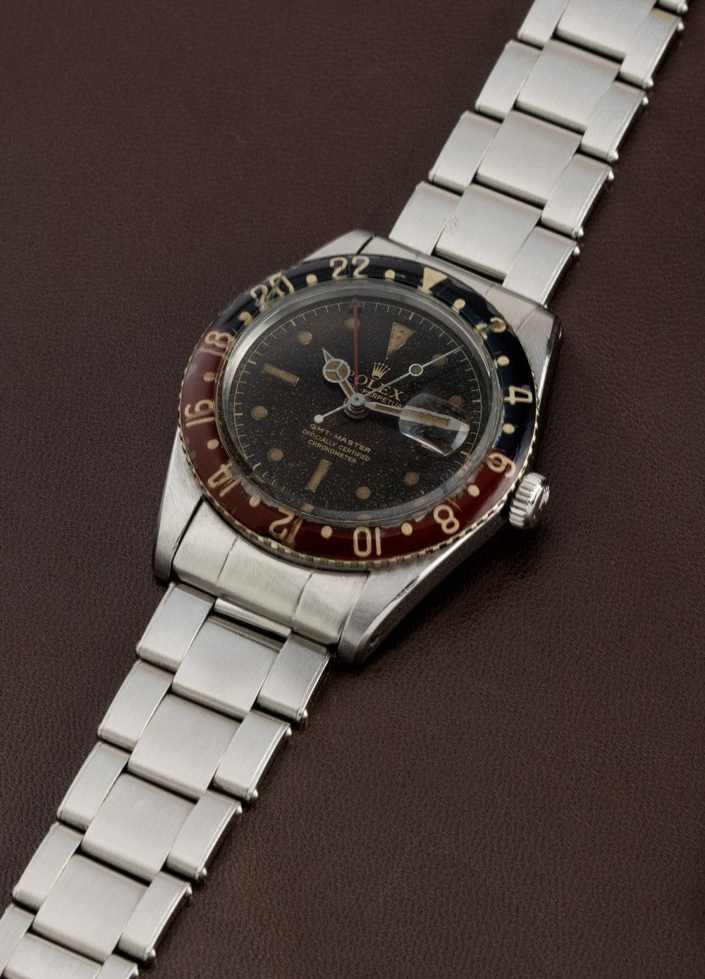 From the various tests carried out in the 1940s, it emerged that one of the methods of counteracting jet lag was to possess an instrument that would simultaneously indicate both the time zone of the place of departure and that of the flight's destination.Pan-Am, the former U.S. flag carrier, was among the first to meet this need, entrusting Rolex with the creation of a watch equipped with the specifications needed by pilots. Rolex then introduced the GMT Master model, equipped with a rotating bakelite bezel and a hand to mark the dual time zone. In the late 1950s and early 1960s, it was realized that the radioactive material that was used in making the GMT's luminous bezel was dangerous. The Maison therefore issued an announcement inviting owners of this model to return the watch to the parent company in order to replace the radioactive bakelite bezel with a metal one. The fragility of the old bezel, combined with this replacement action carried out by the Maison itself, has meant that very few examples, such as the one we propose, still have the original bakelite bezel.