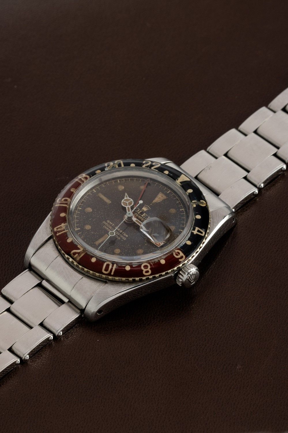 Extremely rare and valuable GMT Master ref 6542 Pepsi with bakelite bezel, tropical turned dial and roulette date window