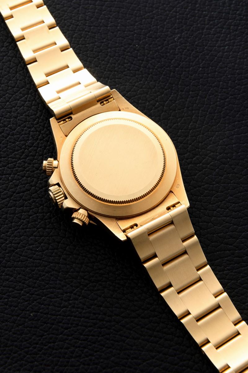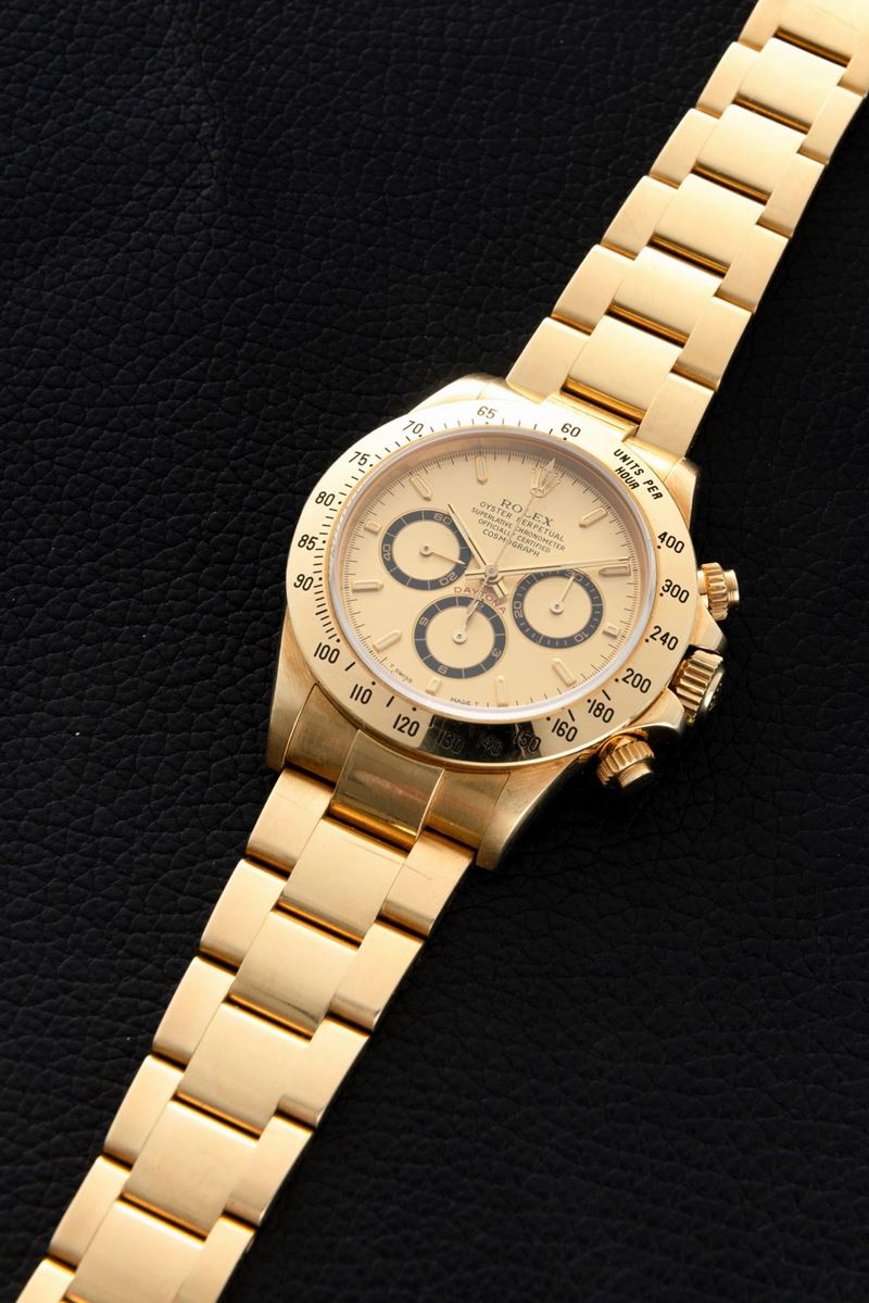 Iconic and sought-after Cosmograph Daytona ref 16528 in 18k yellow gold, champagne dial with black counters, tachymeter bezel and screw-down buttons, Oyster bracelet