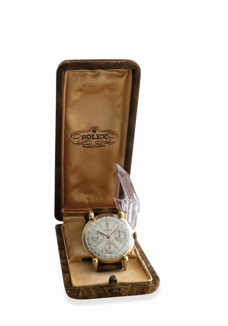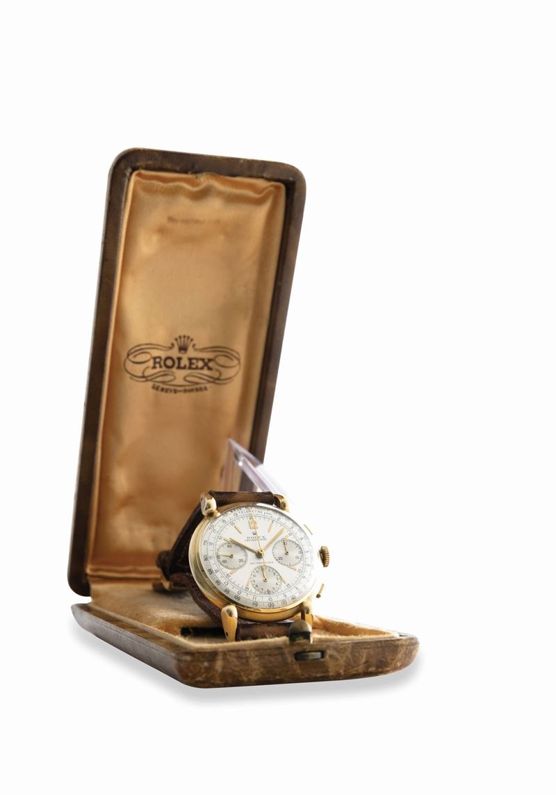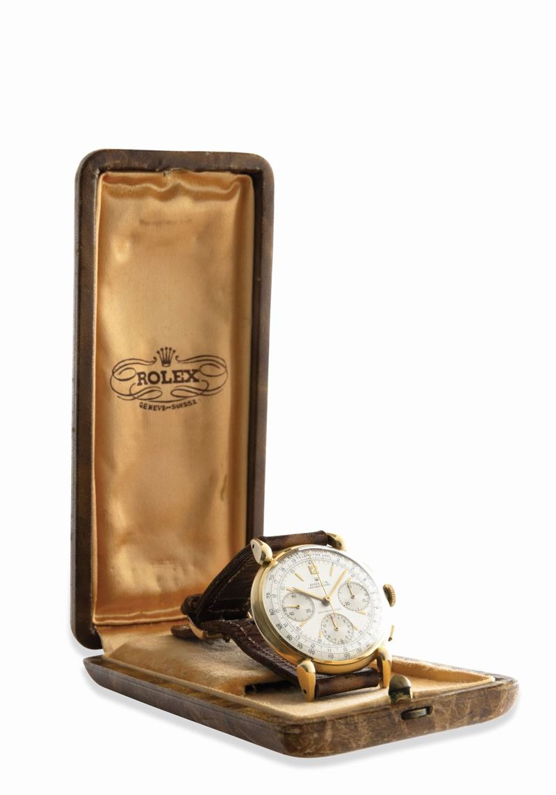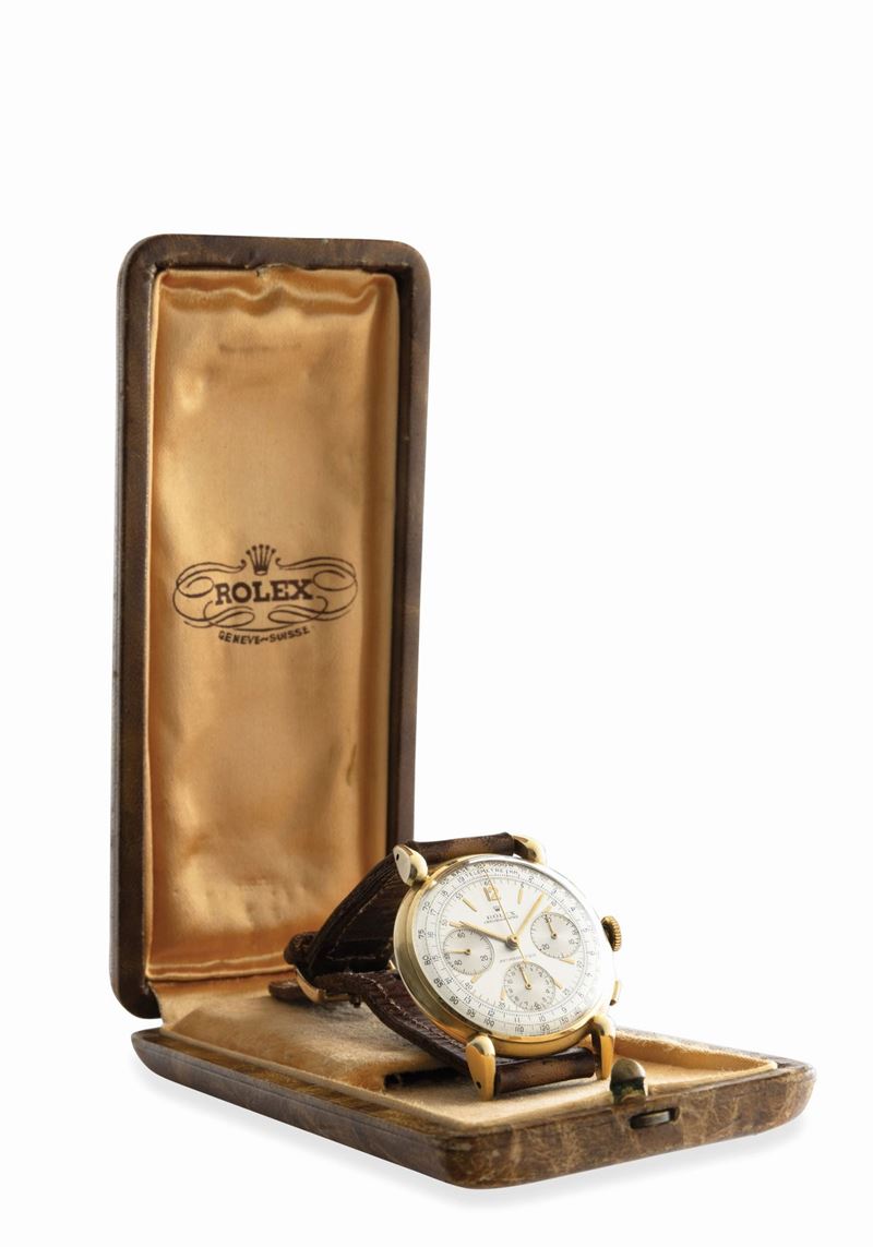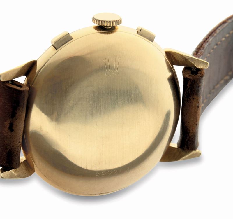 Rare and exceptional three-counter chronograph ref 4313 with square pushers and snap back, drop lugs, manual winding, 18k [..]