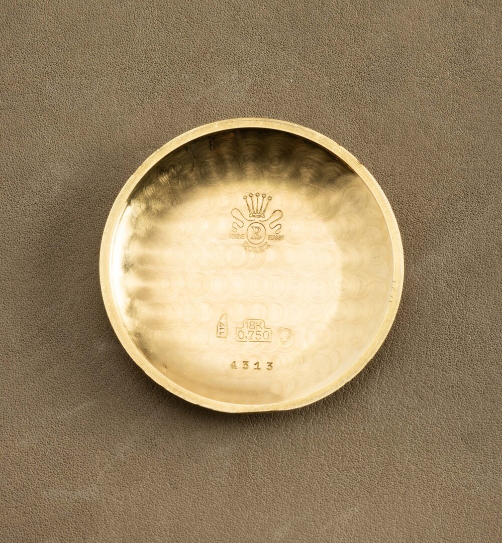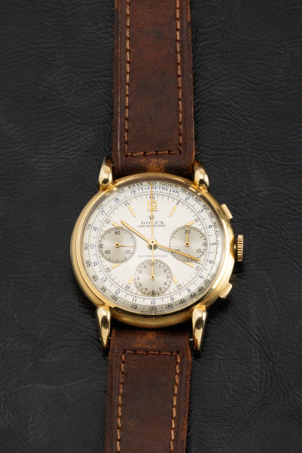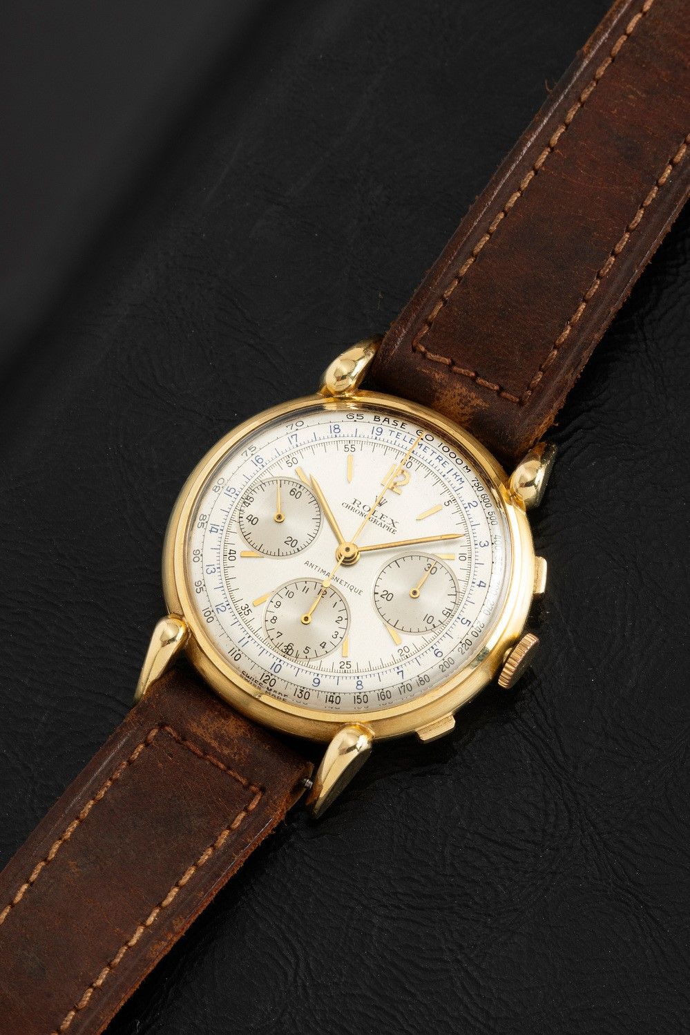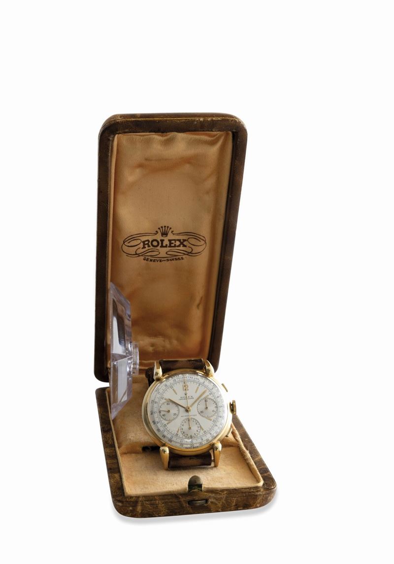 Rare and exceptional three-counter chronograph ref 4313 with square pushers and snap back, drop lugs, manual winding, 18k [..]
