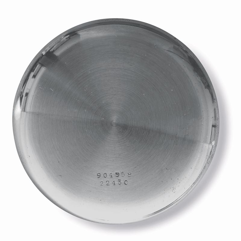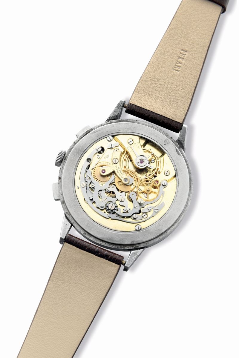Rare and fascinating Compaxref 22430 oversized steel chronograph, black gilt dial with radium Arabic numerals, 1940s