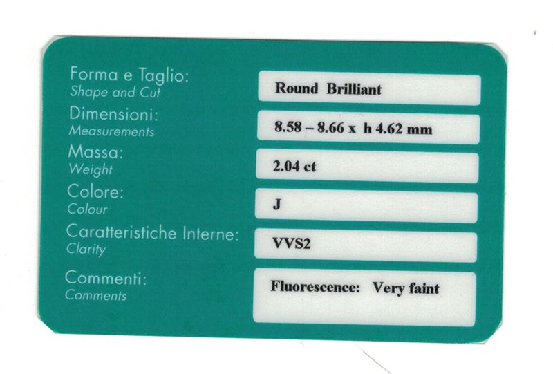 Brilliant-cut diamond weight 2.04 carats, color J, clarity VVS2, fluorescence very faint. Gemmological Report RAG Torino n. DV23191