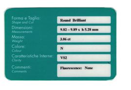 Brilliant-cut diamond weight 3.06 carats, color N, clarity VS2, fluorescence none. Gemmological Report R.A.G. Torino n. DV23190