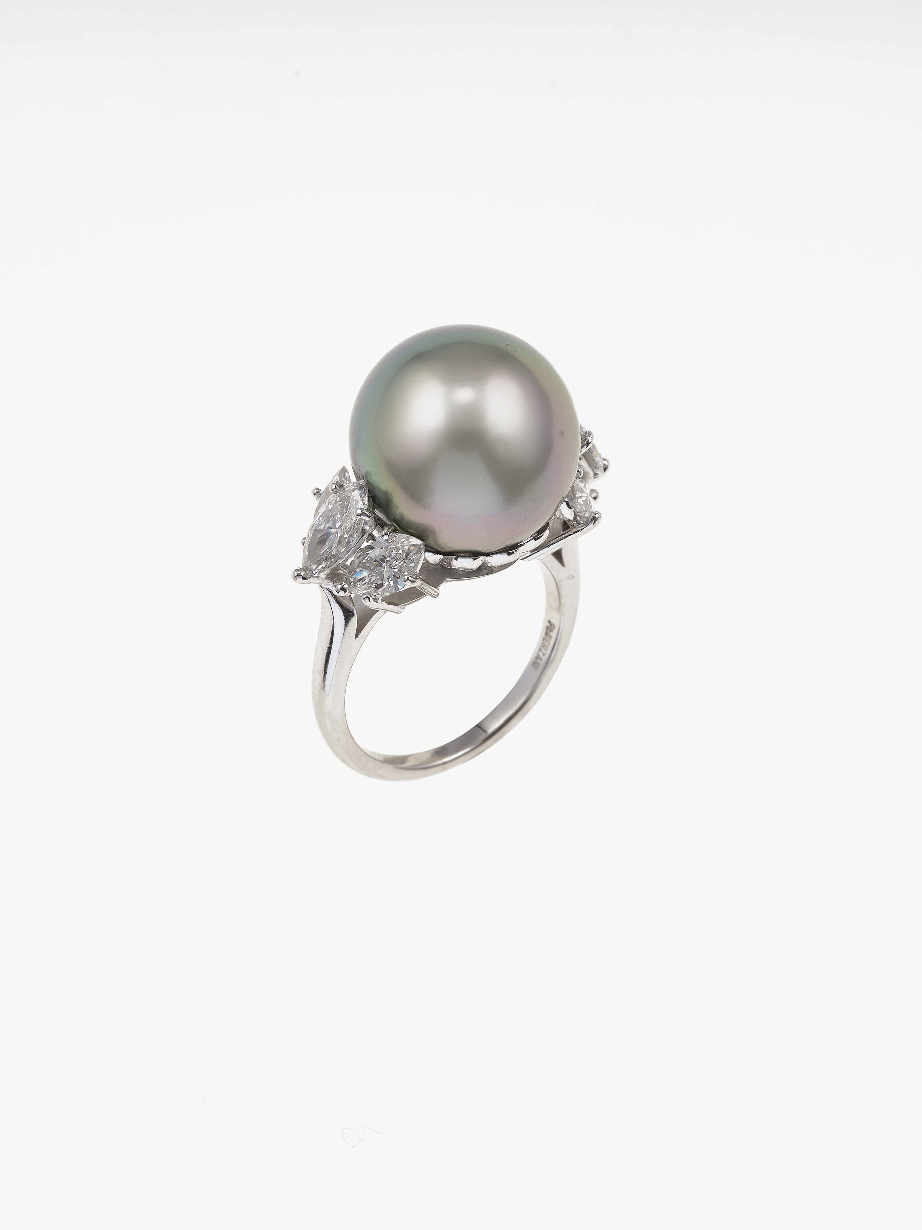Cultured grey pearl, diamond and platinum ring. Signed Pederzani
