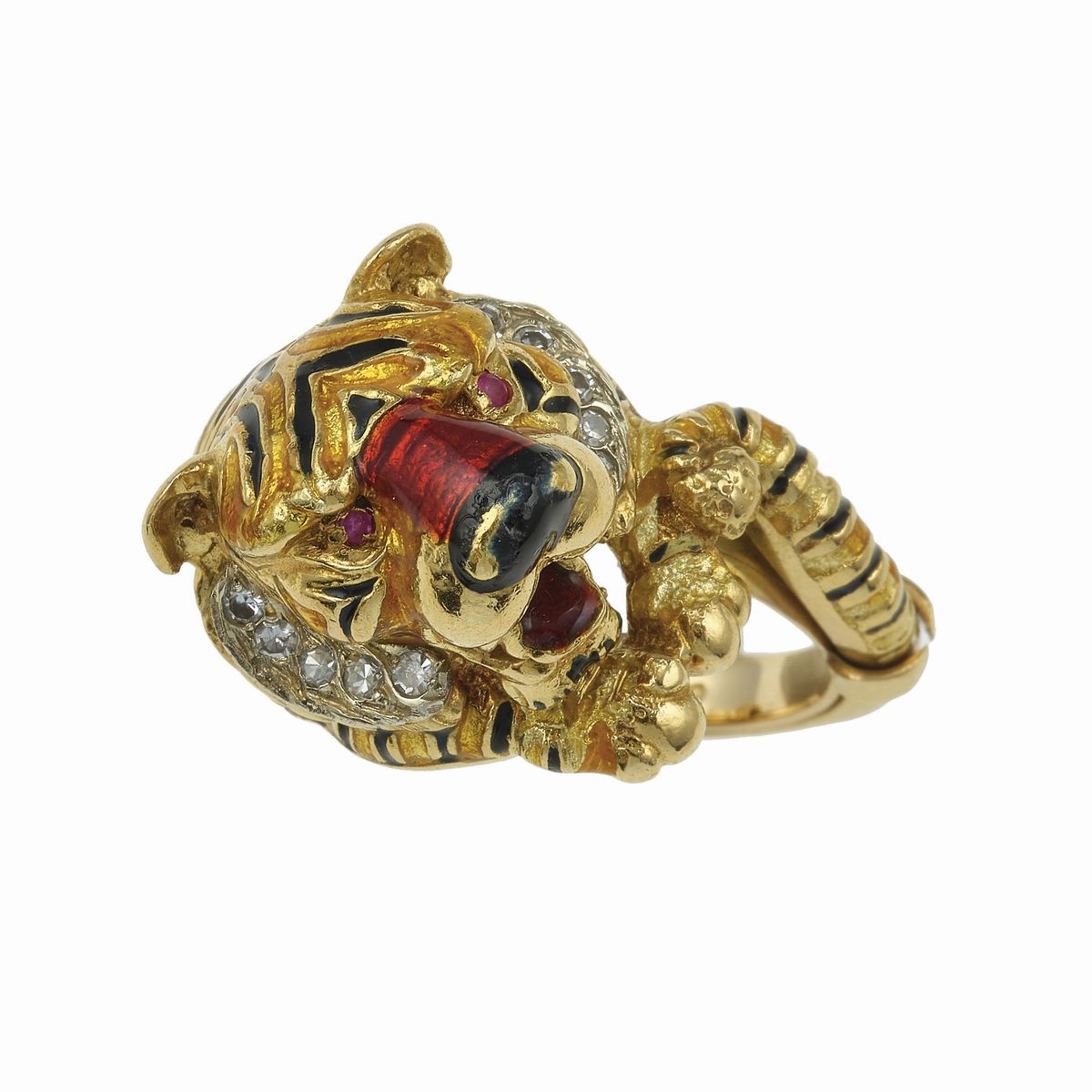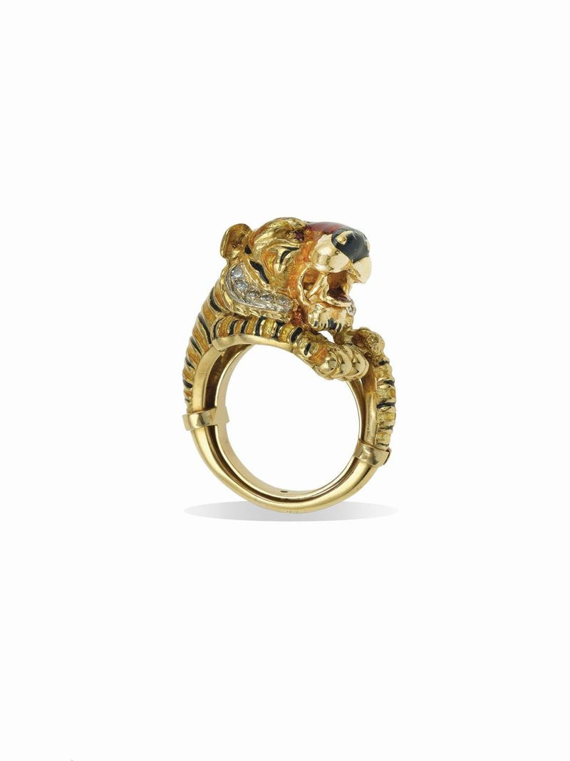 Enamel, dimonds, ruby and gold ring. Signed Frascarolo