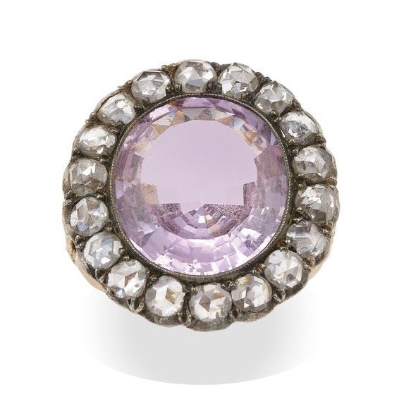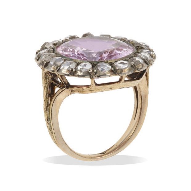Old-cut diamond and kunzite ring