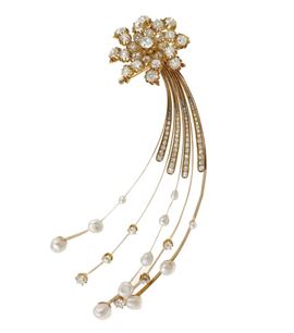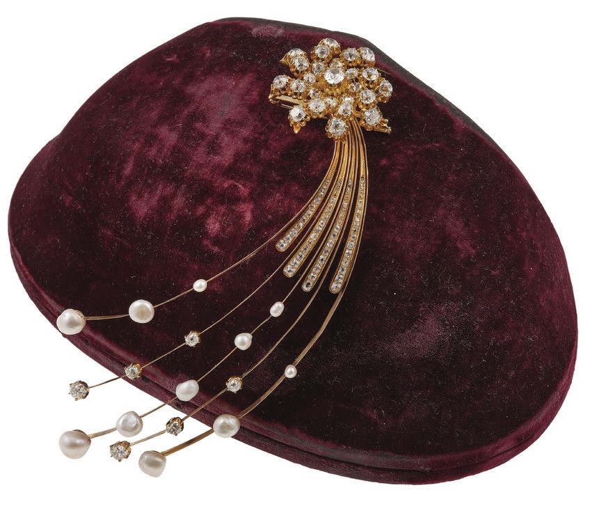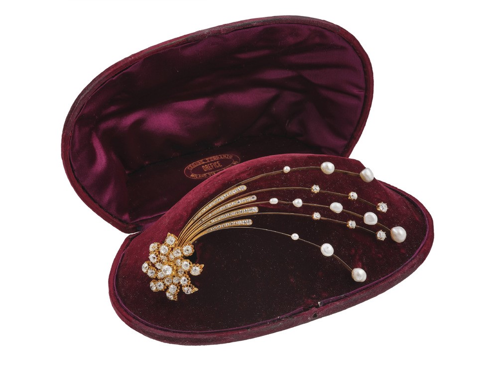 Old-cut diamond and pearl aigrette. Fitted case