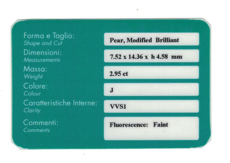 Pear modified brilliant cut diamond, weight 2.95 carats, color J, clarity VVS1, fluorescence faint. Gemological Report R.A.G. Torino n. DV23185