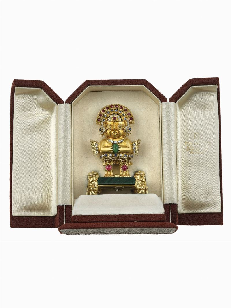 Ruby, diamond, sapphires, emerald brooch. Fitted case