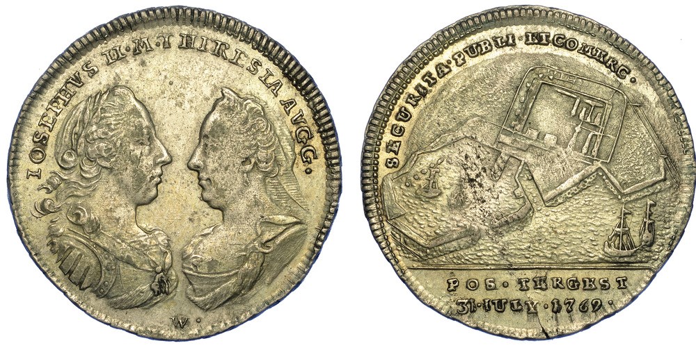 Busti affrontati di Giuseppe II e Maria Teresa. R/ Veduta del porto di Trieste. Opus Wideman. g. 3,88. Diam. mm. 25,57. Arg. Buon BB