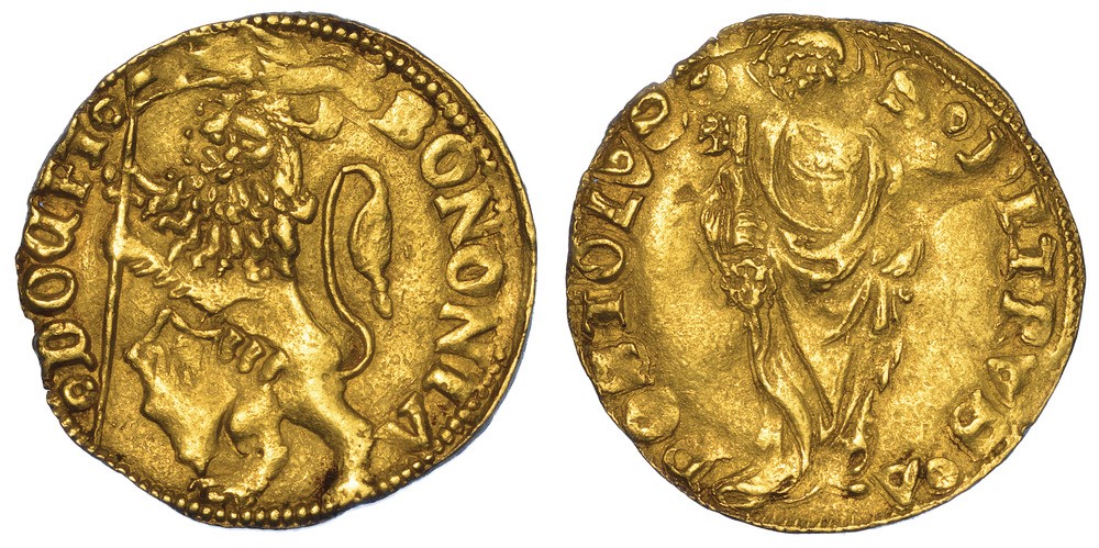 Leone vessillifero rampante a s. R/ S. Pietro stante di fronte con chiavi. MIR 21. CNI 20. Rarissimo. g. 3,44. Diam. mm. 23,35. Oro. BB/MB